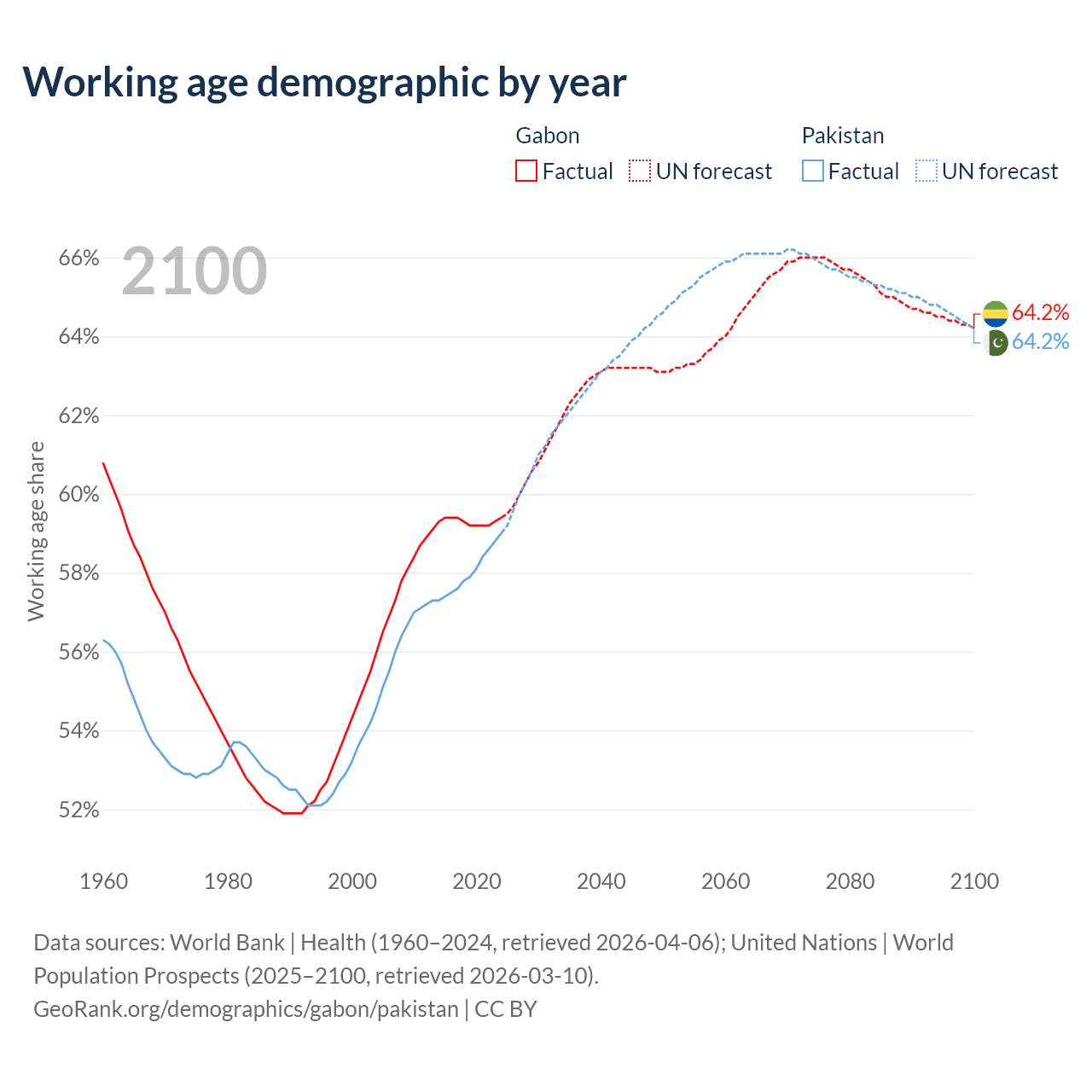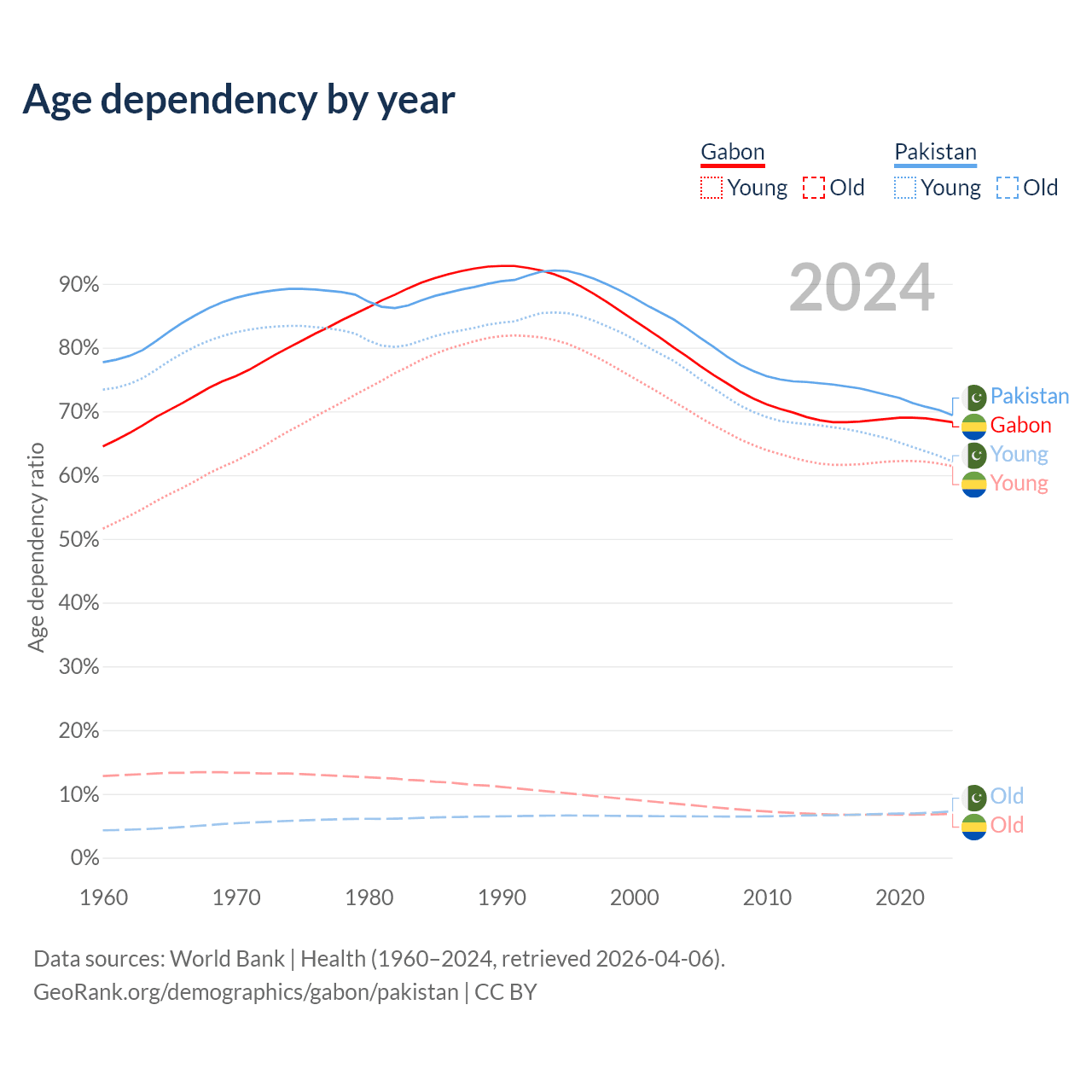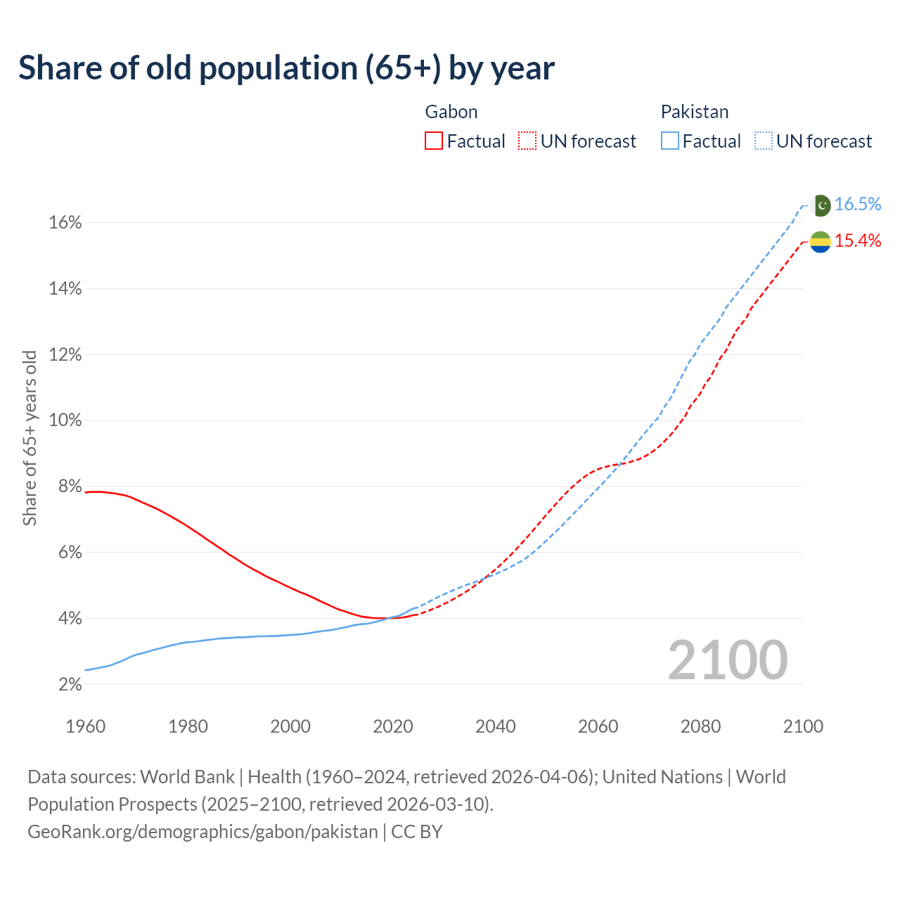 - The share of old-age demographic (65+) in Gabon is 4.08% vs 4.28% in Pakistan.