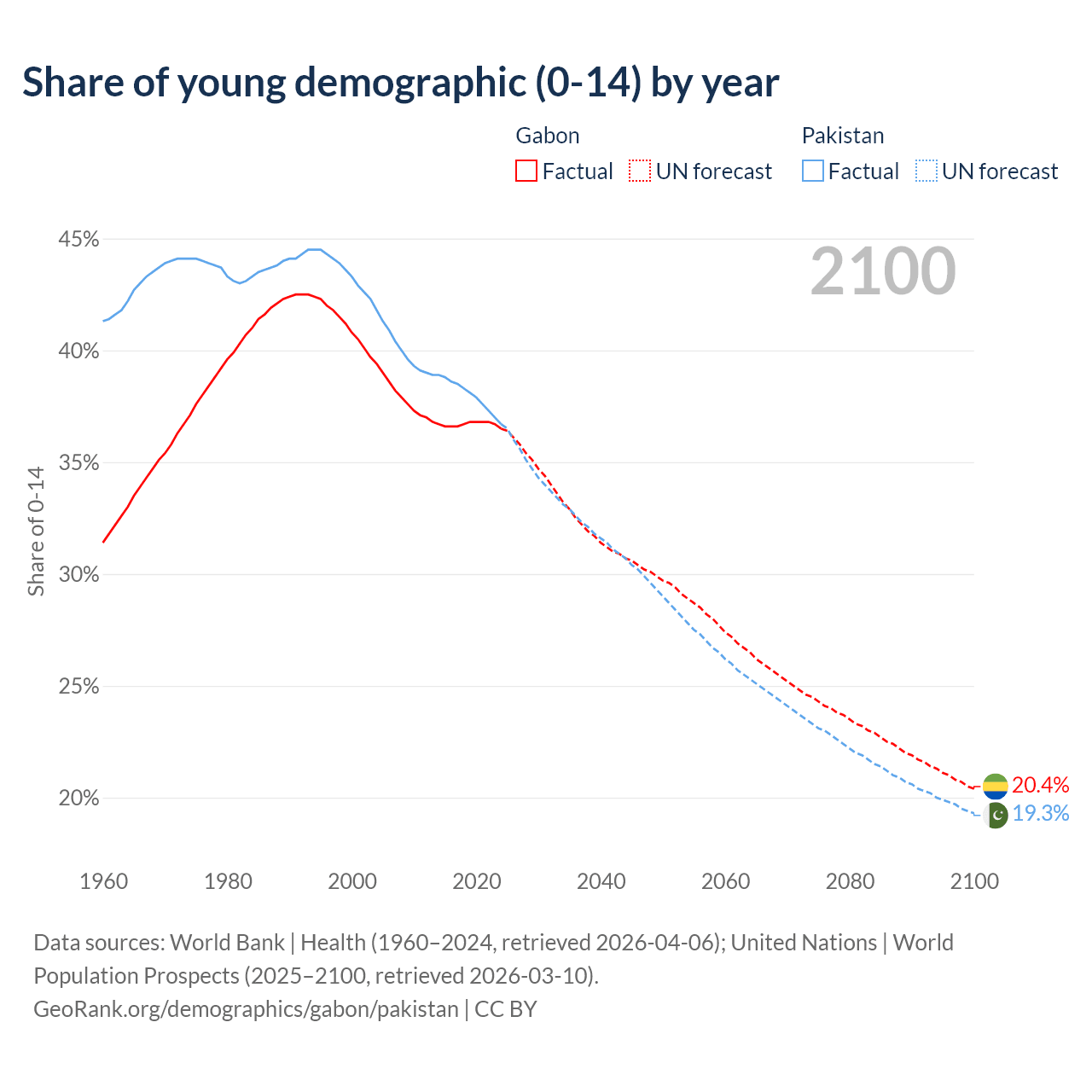 - The share of young demographic (0-15 years old) in Gabon is 36.5% vs 36.7% in Pakistan.