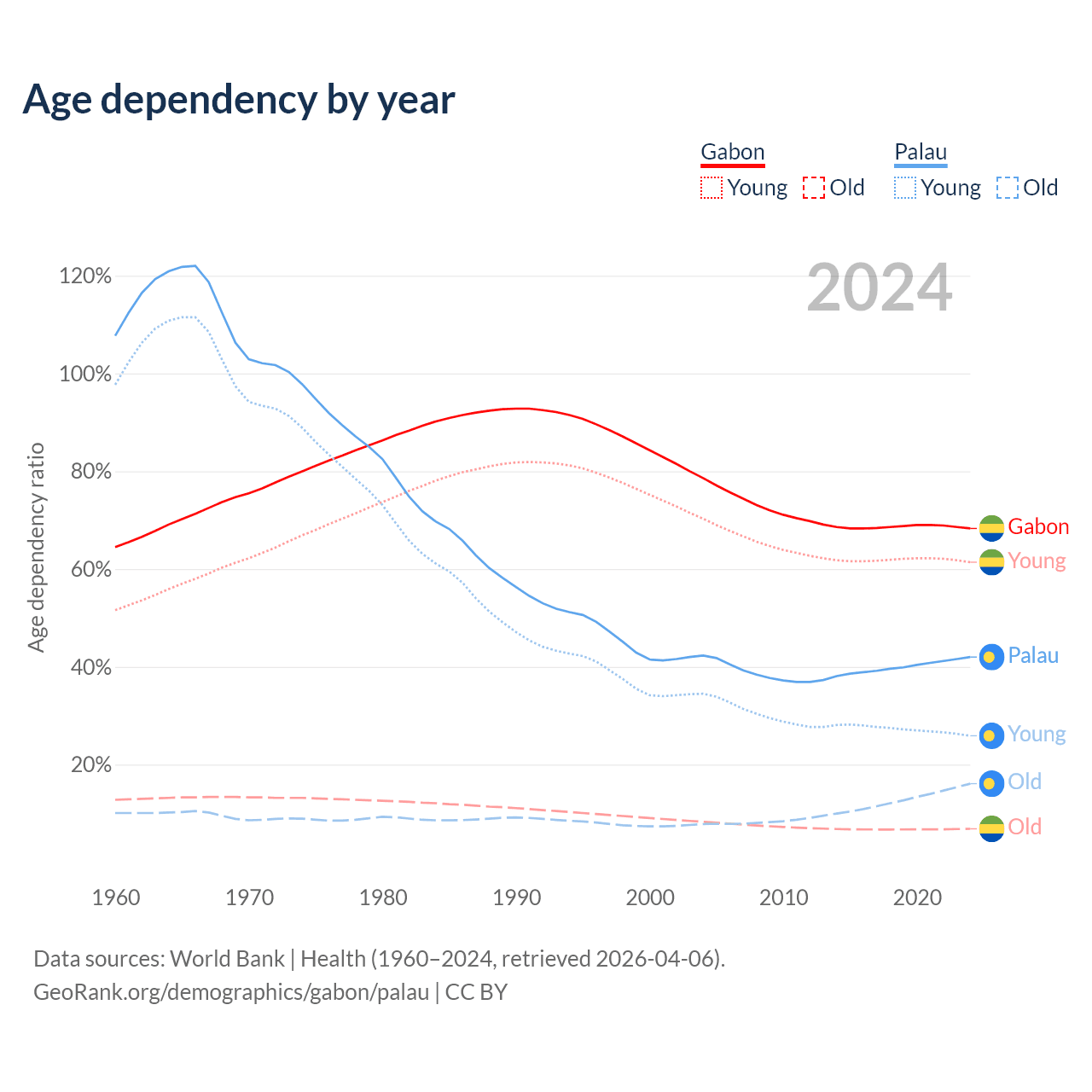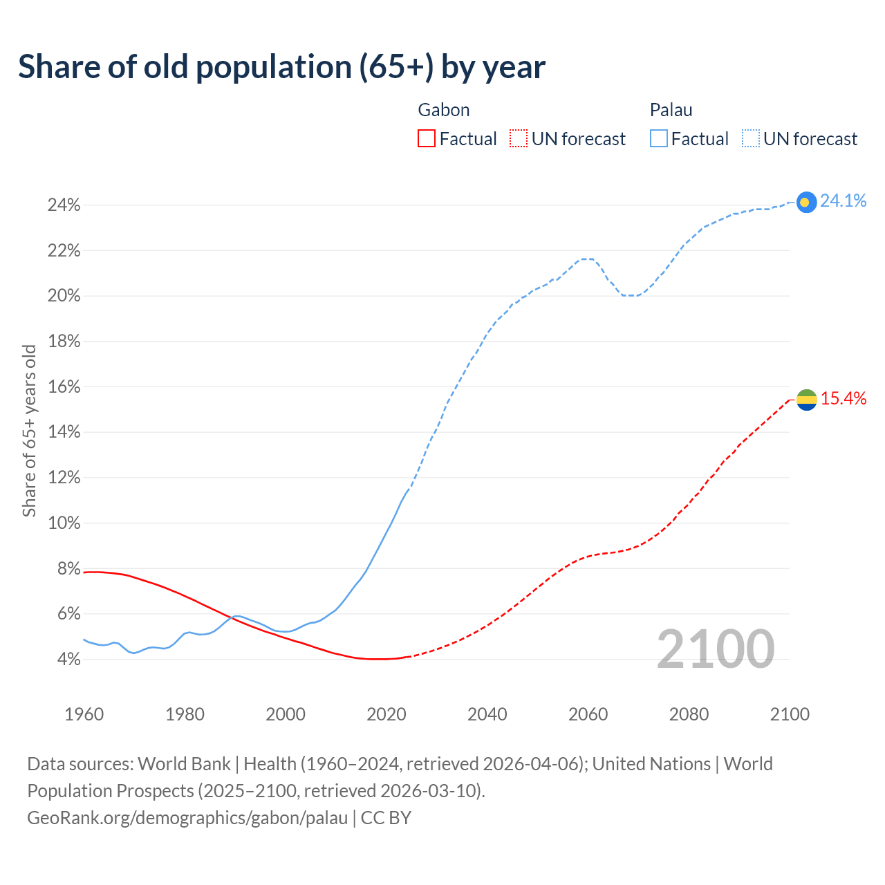 - The share of old-age demographic (65+) in Gabon is 4.08% vs 11.3% in Palau.