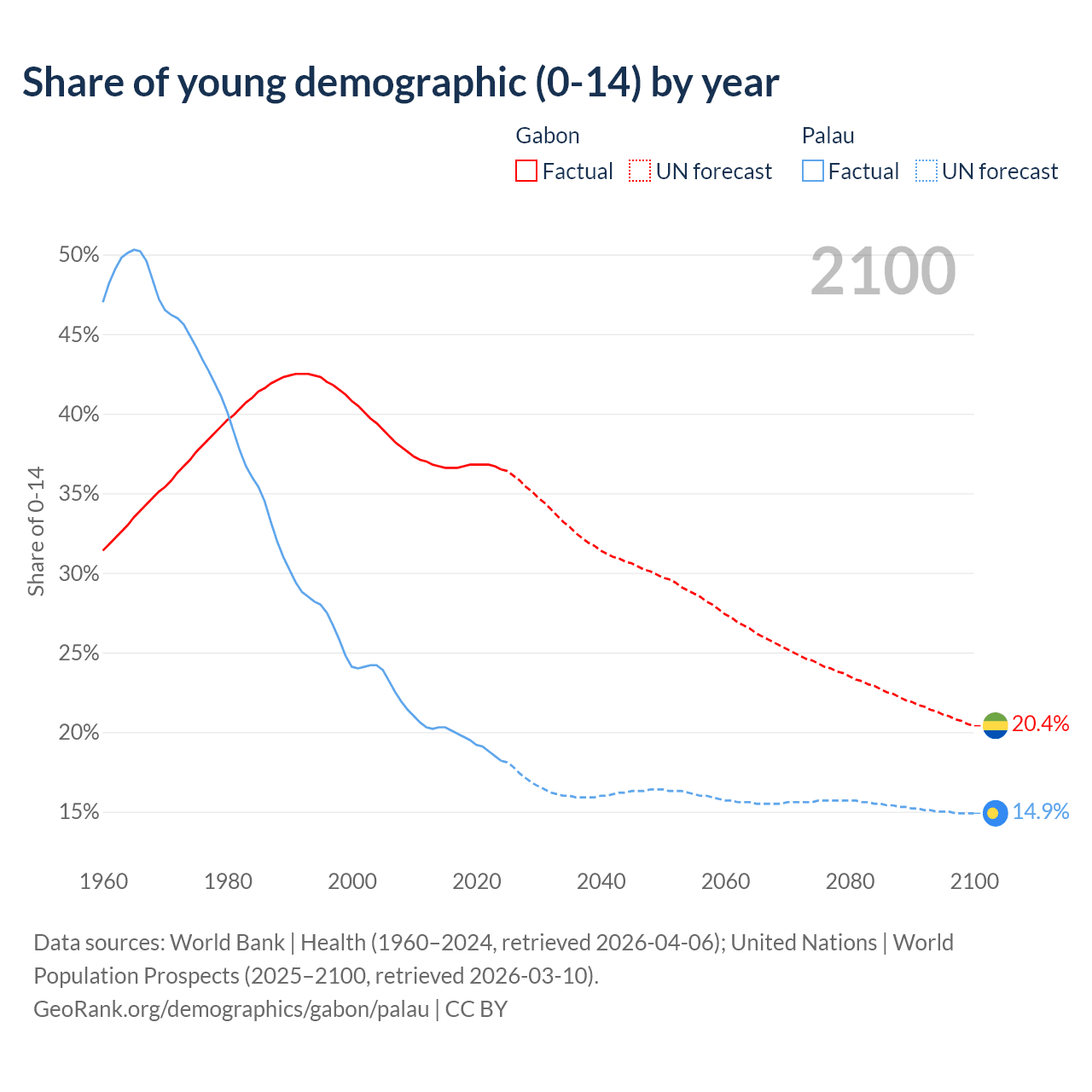 - The share of young demographic (0-15 years old) in Gabon is 36.5% vs 18.2% in Palau.