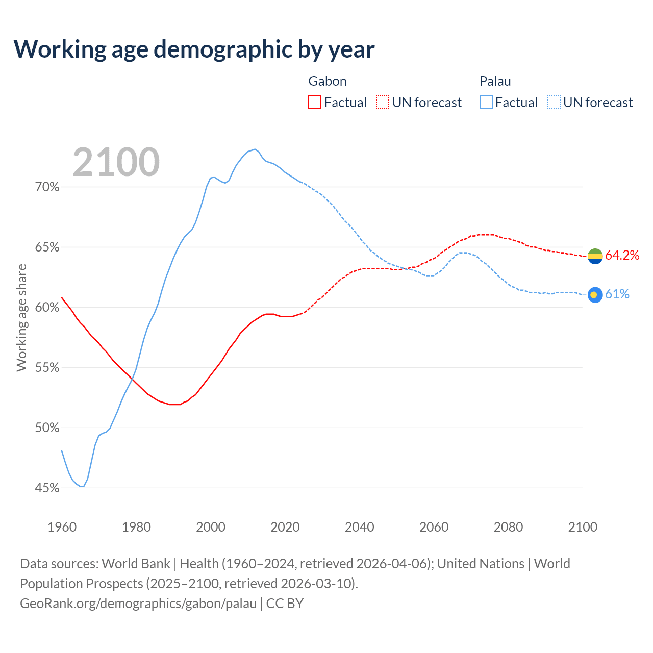 The share of older people aged 65 and over is 4.08% in Gabon and 11.3% in Palau. Life expectancy in Gabon compared to Palau .