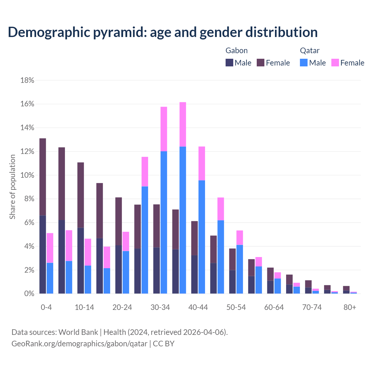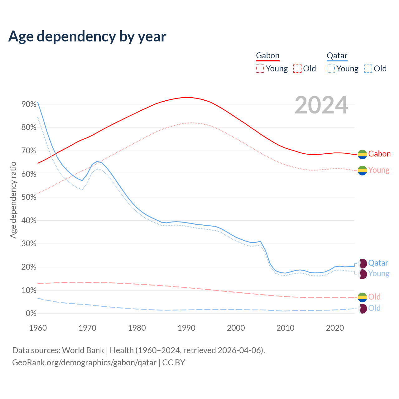 - Gabon is ranked 144/196 by median age (oldest to youngest) vs 78/196 for Qatar.