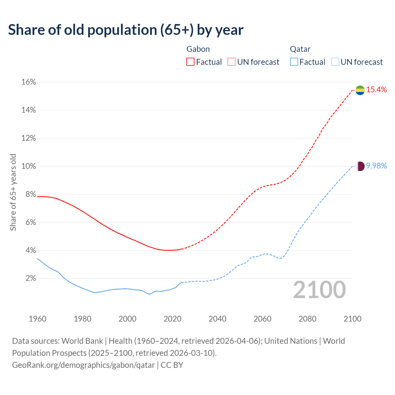 The share of older people aged 65 and over is 4.08% in Gabon and 1.68% in Qatar. Life expectancy in Gabon compared to Qatar .