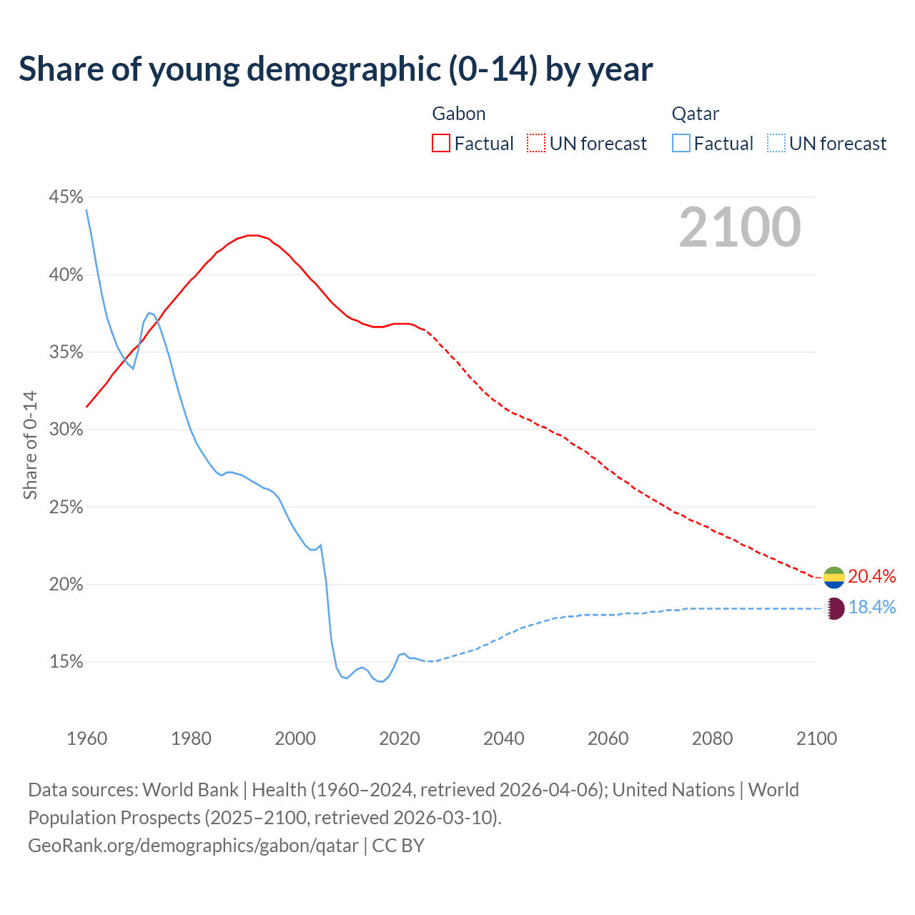 - The share of young demographic (0-15 years old) in Gabon is 36.5% vs 15.1% in Qatar.