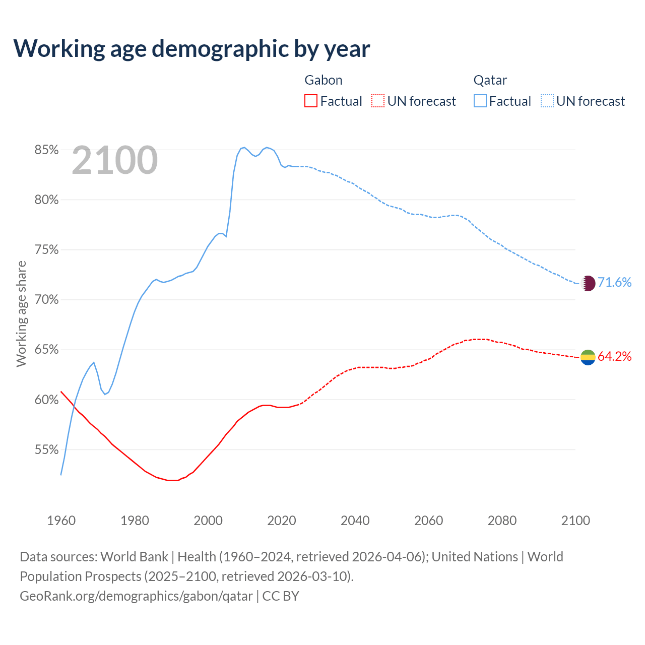 - Gabon has 1.58M working age adults (aged 15-64) vs 2.5M in Qatar.