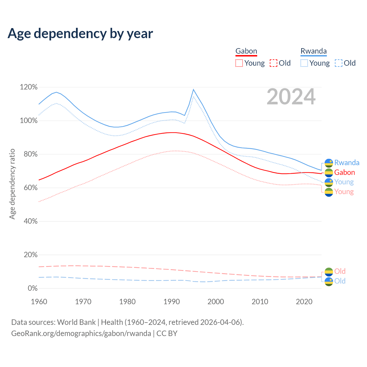 - The share of old-age demographic (65+) in Gabon is 4.08% vs 3.93% in Rwanda.