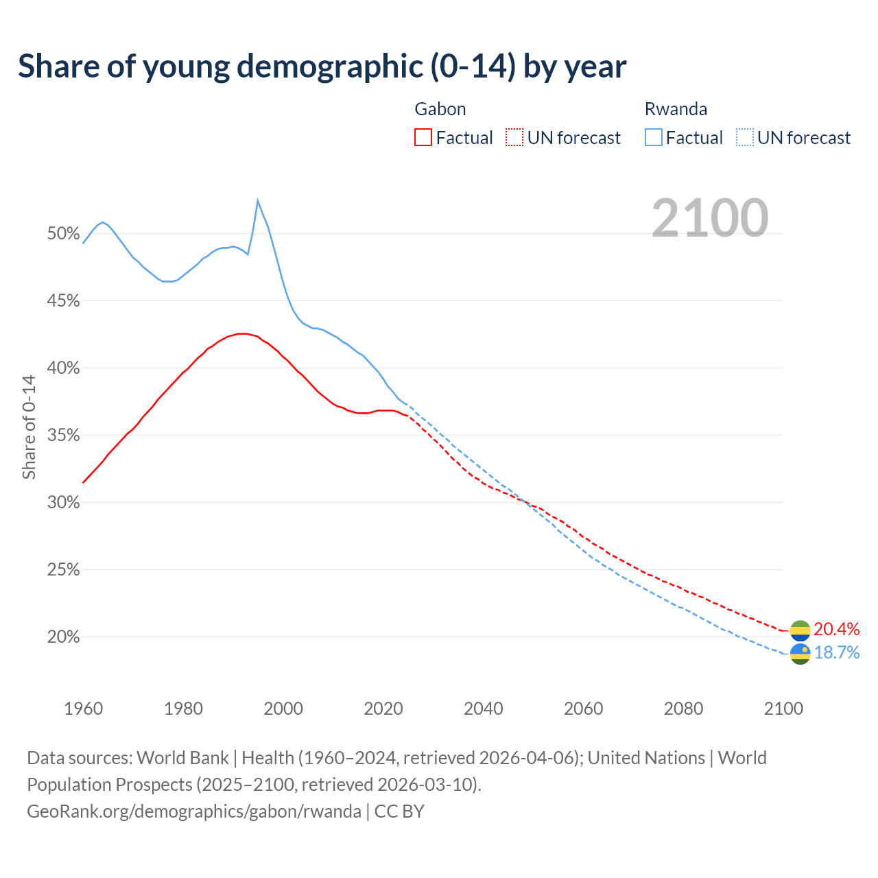 Median age Gabon vs Rwanda, 1960-2100