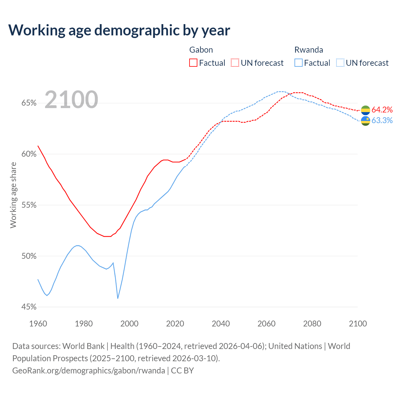 - Gabon has 1.58M working age adults (aged 15-64) vs 8.79M in Rwanda.