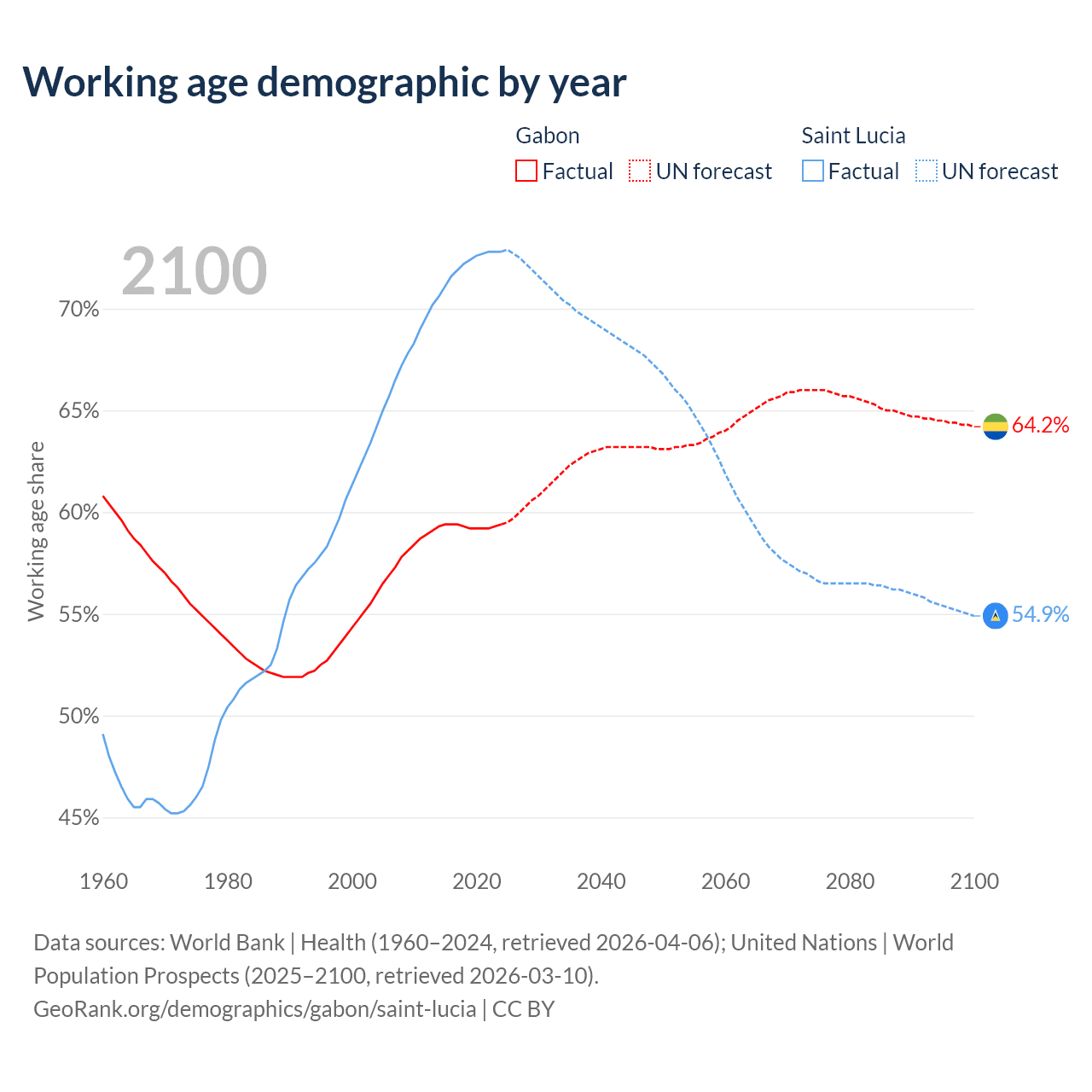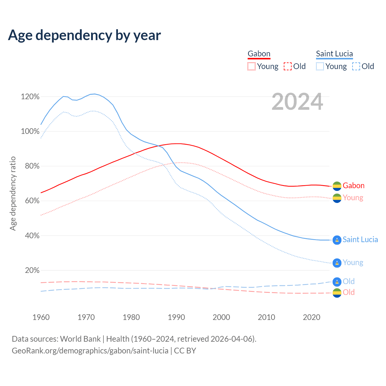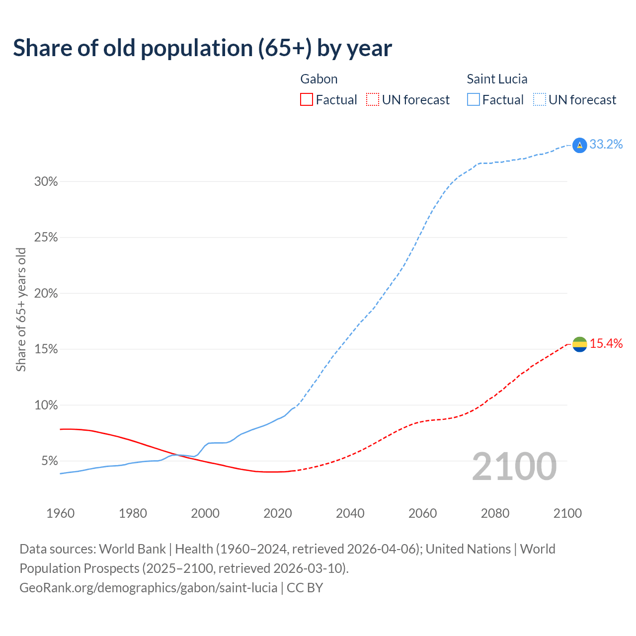 - The share of old-age demographic (65+) in Gabon is 4.08% vs 9.62% in Saint Lucia.