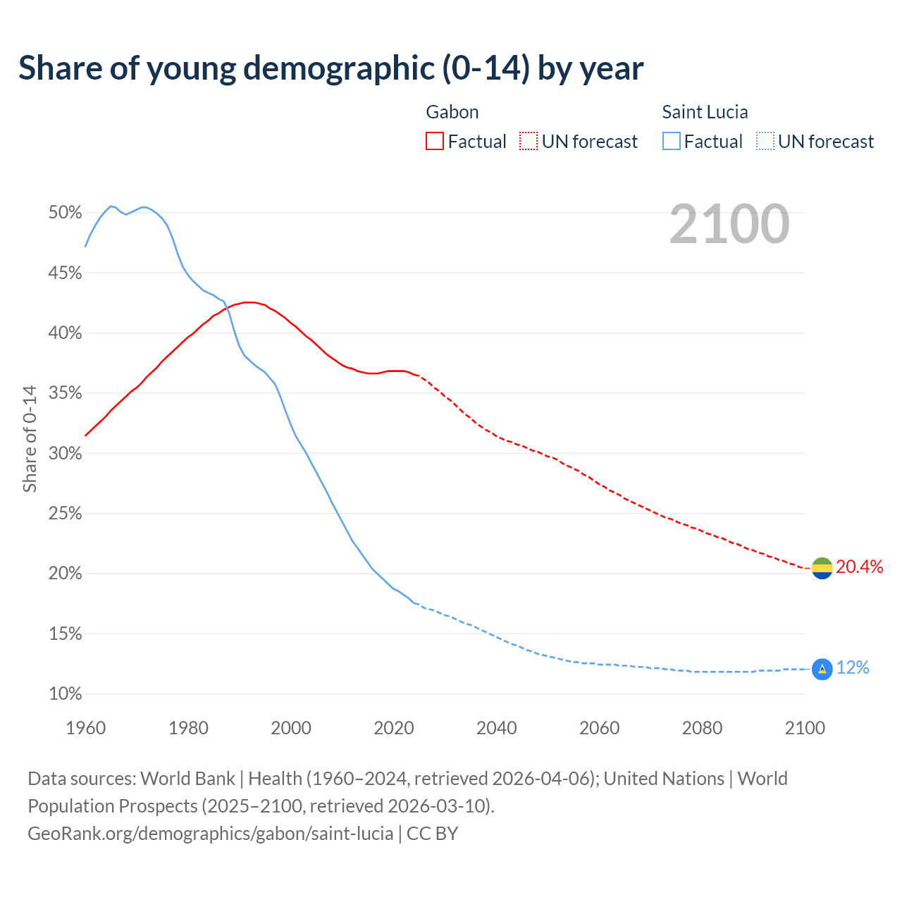 - The share of young demographic (0-15 years old) in Gabon is 36.5% vs 17.5% in Saint Lucia.