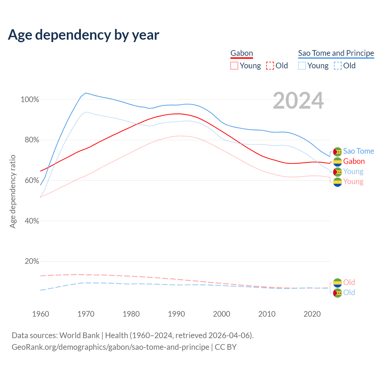 - Gabon is ranked 144/196 by median age (oldest to youngest) vs 163/196 for Sao Tome and Principe.