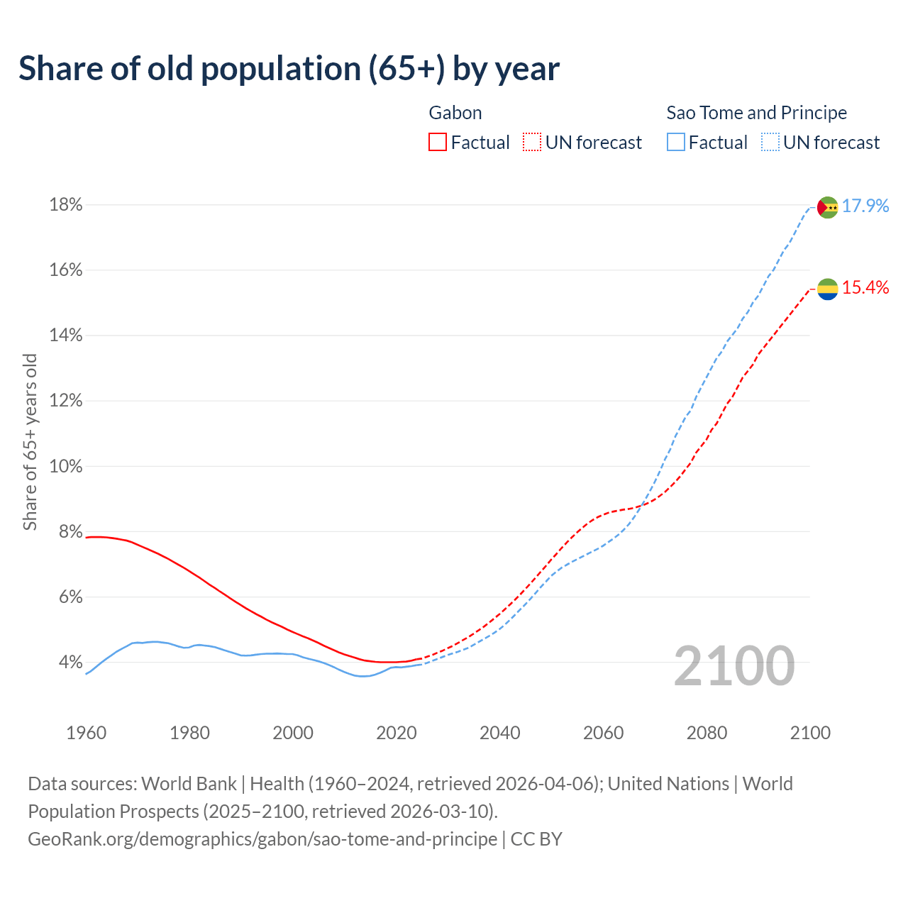 - The share of old-age demographic (65+) in Gabon is 4.08% vs 3.9% in Sao Tome and Principe.