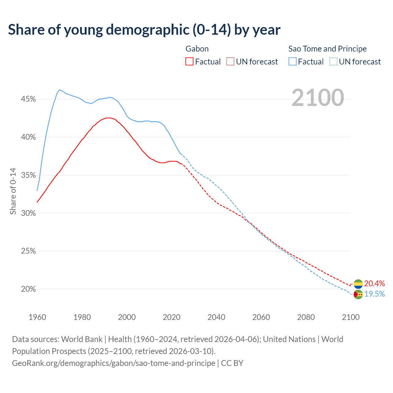- The share of young demographic (0-15 years old) in Gabon is 36.5% vs 37.8% in Sao Tome and Principe.