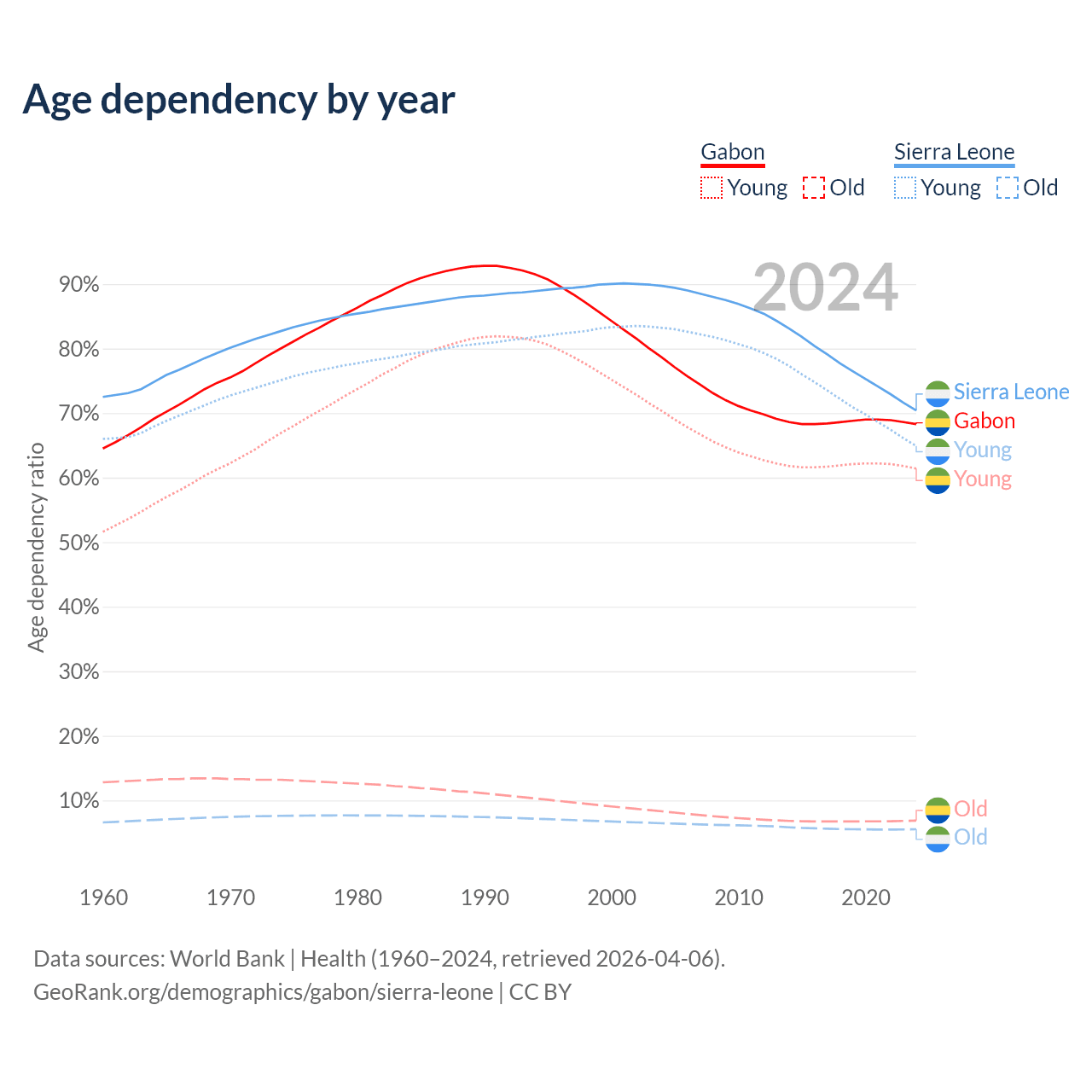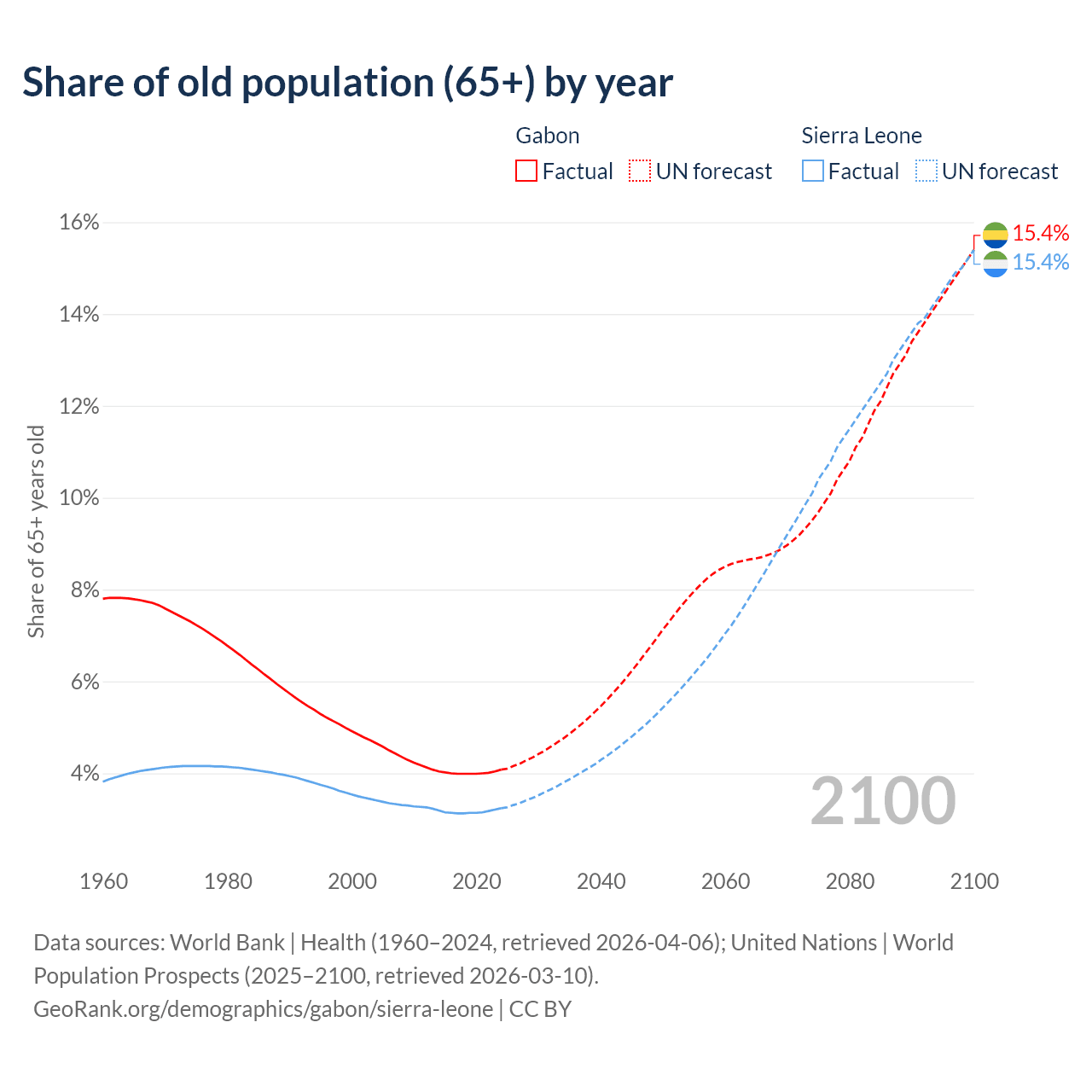 - The share of old-age demographic (65+) in Gabon is 4.08% vs 3.24% in Sierra Leone.