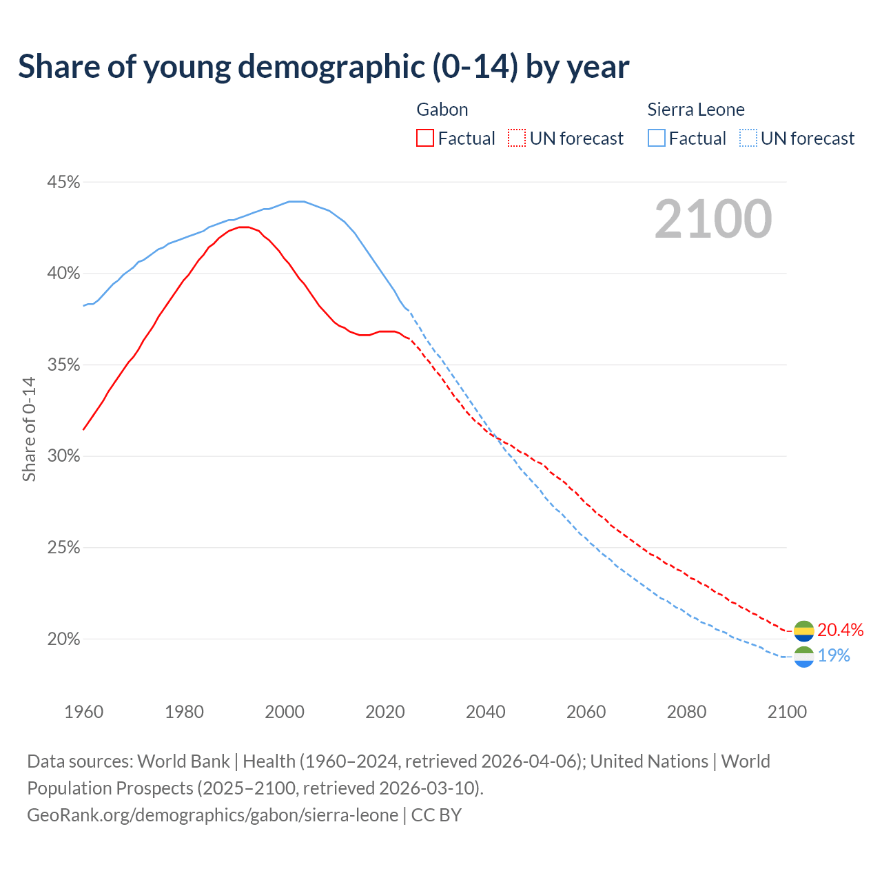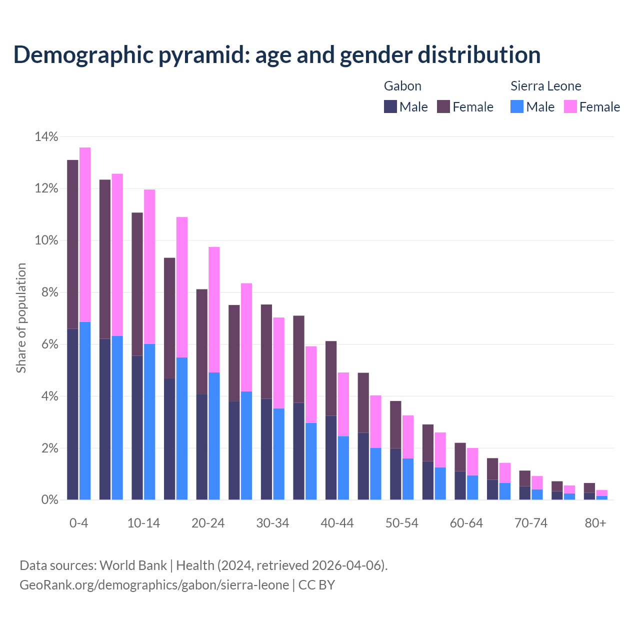 - As of 2026, the population of Gabon is 2.66M vs 9.05M in Sierra Leone - 3.4 times difference.