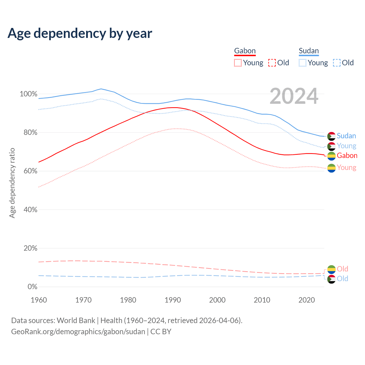 - Gabon is ranked 144/196 by median age (oldest to youngest) vs 172/196 for Sudan.