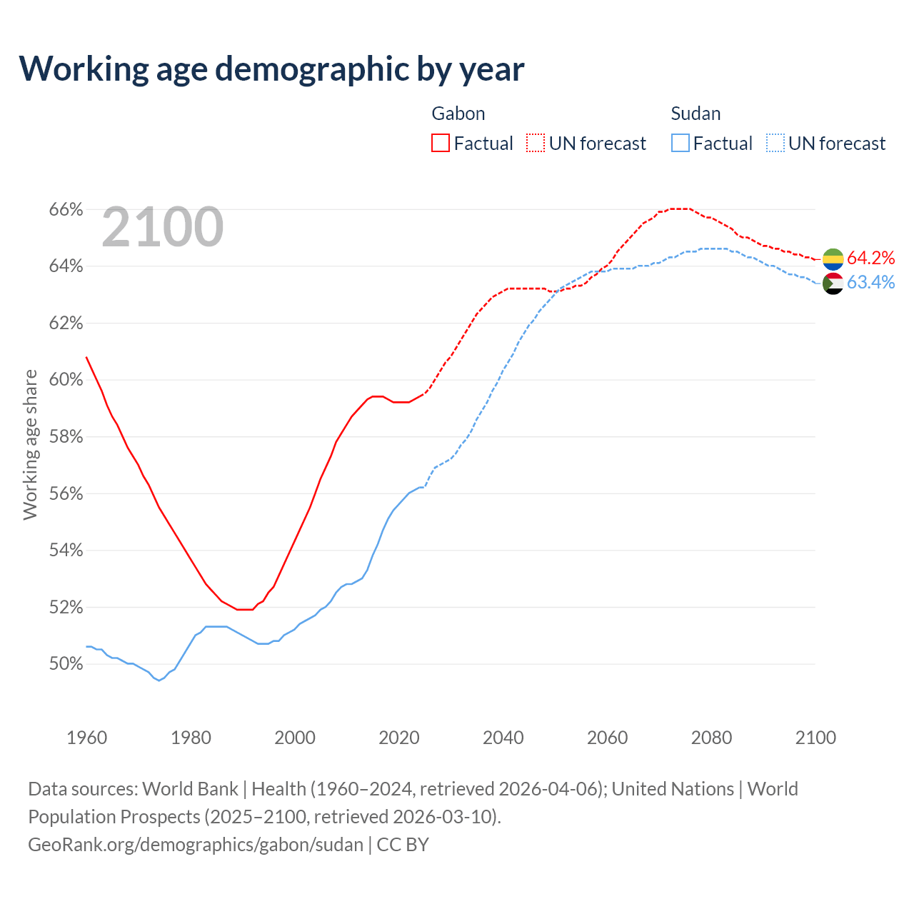 Median age Gabon vs Sudan, 1960-2100