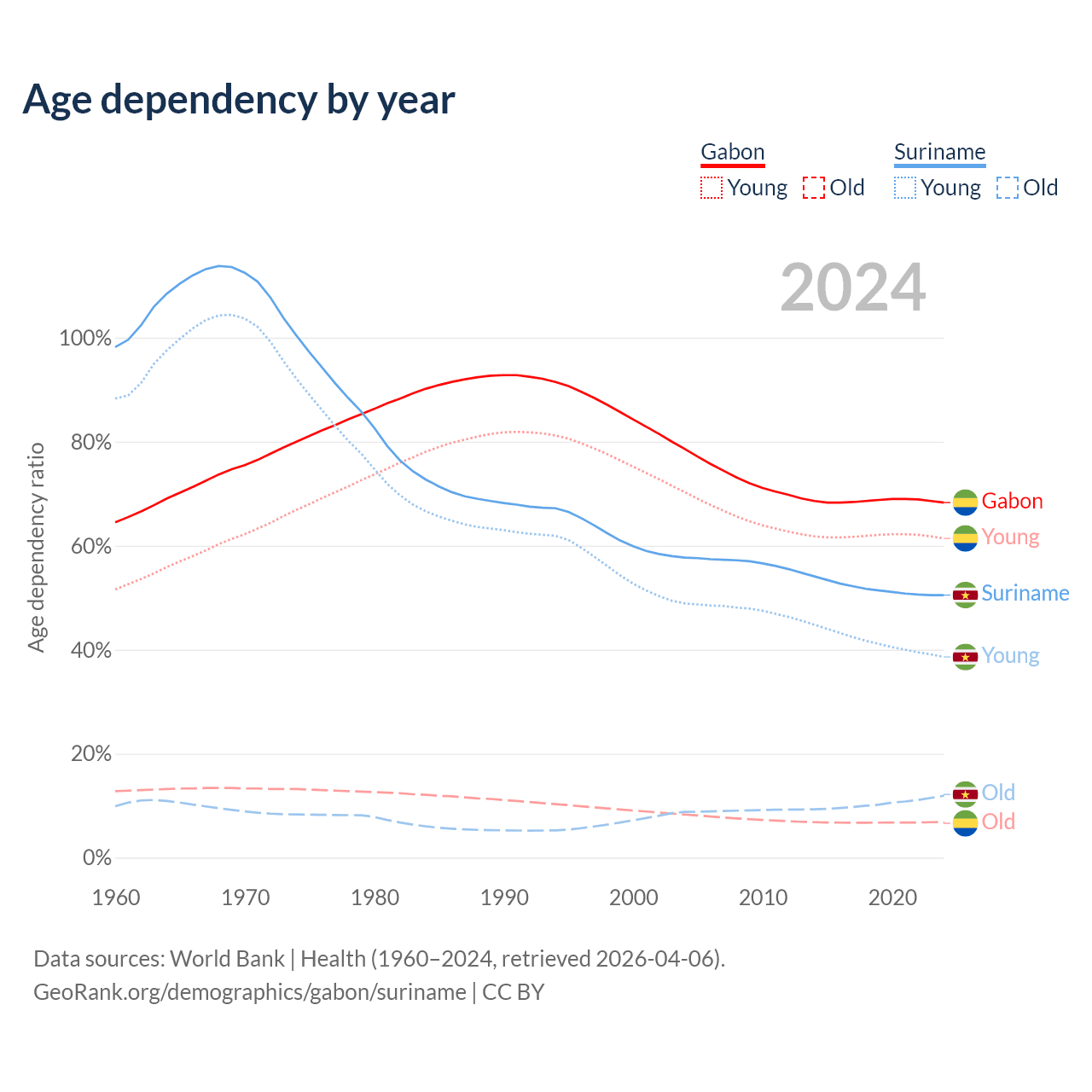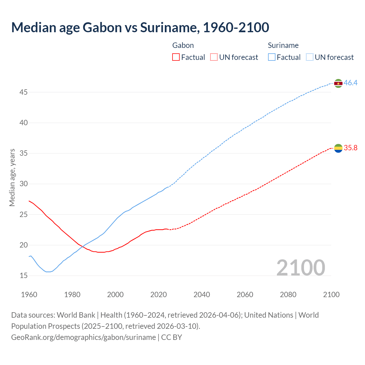 - Gabon is ranked 144/196 by median age (oldest to youngest) vs 109/196 for Suriname.