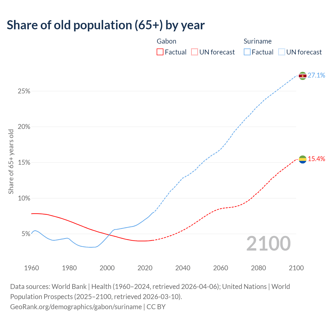 The share of older people aged 65 and over is 4.08% in Gabon and 7.9% in Suriname. Life expectancy in Gabon compared to Suriname .