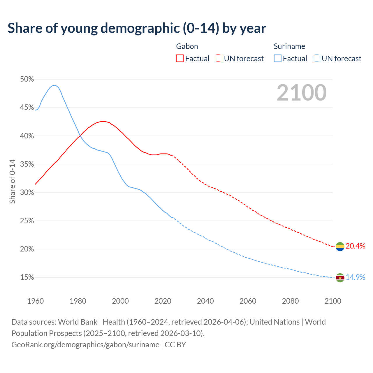 - The share of young demographic (0-15 years old) in Gabon is 36.5% vs 25.6% in Suriname.