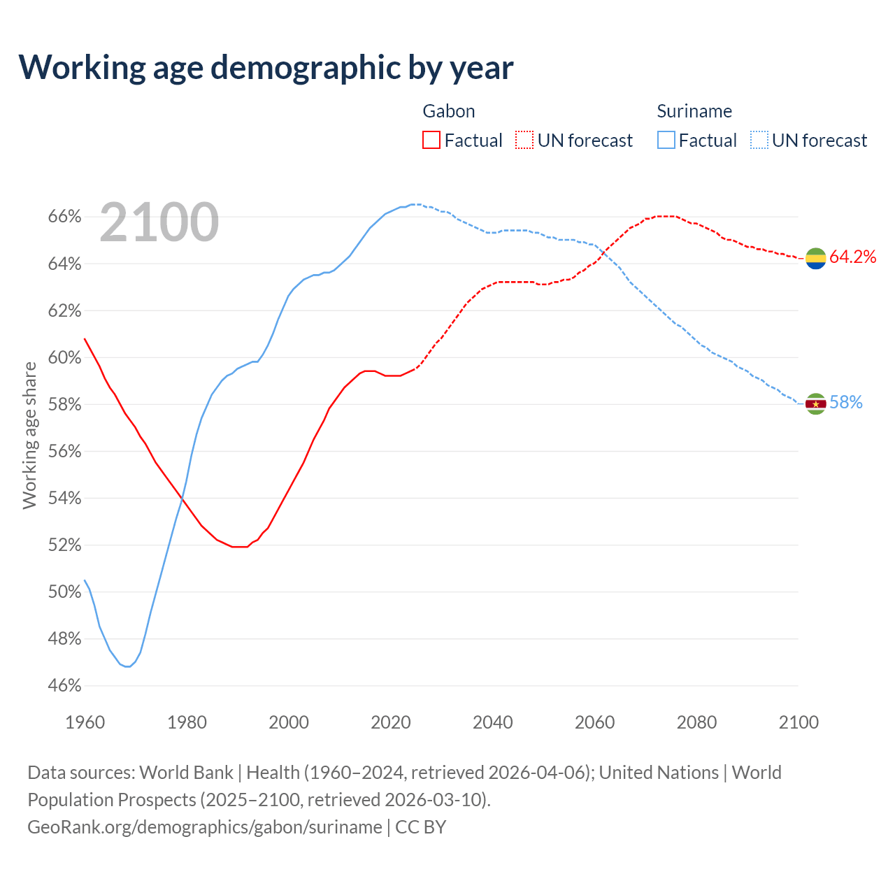 - Gabon has 1.58M working age adults (aged 15-64) vs 430K in Suriname.