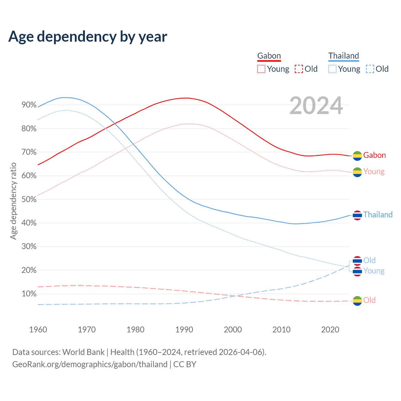 - Gabon is ranked 144/196 by median age (oldest to youngest) vs 40/196 for Thailand.