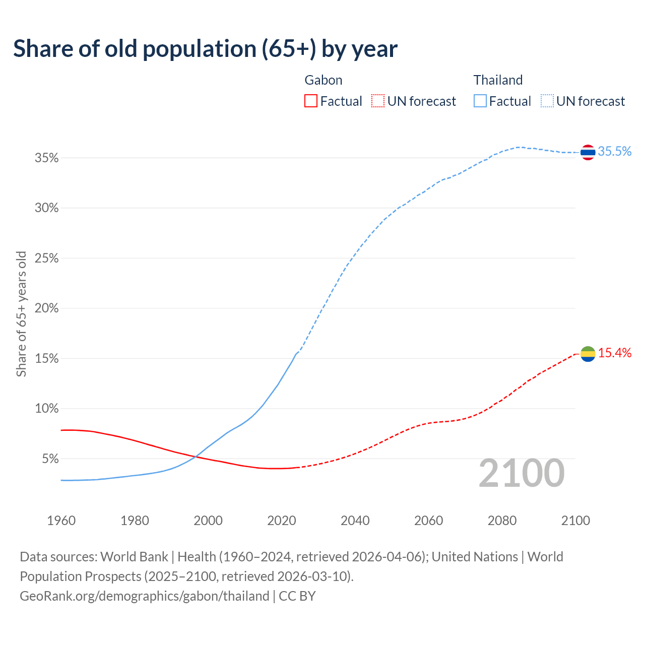 The share of older people aged 65 and over is 4.08% in Gabon and 15.4% in Thailand. Life expectancy in Gabon compared to Thailand .