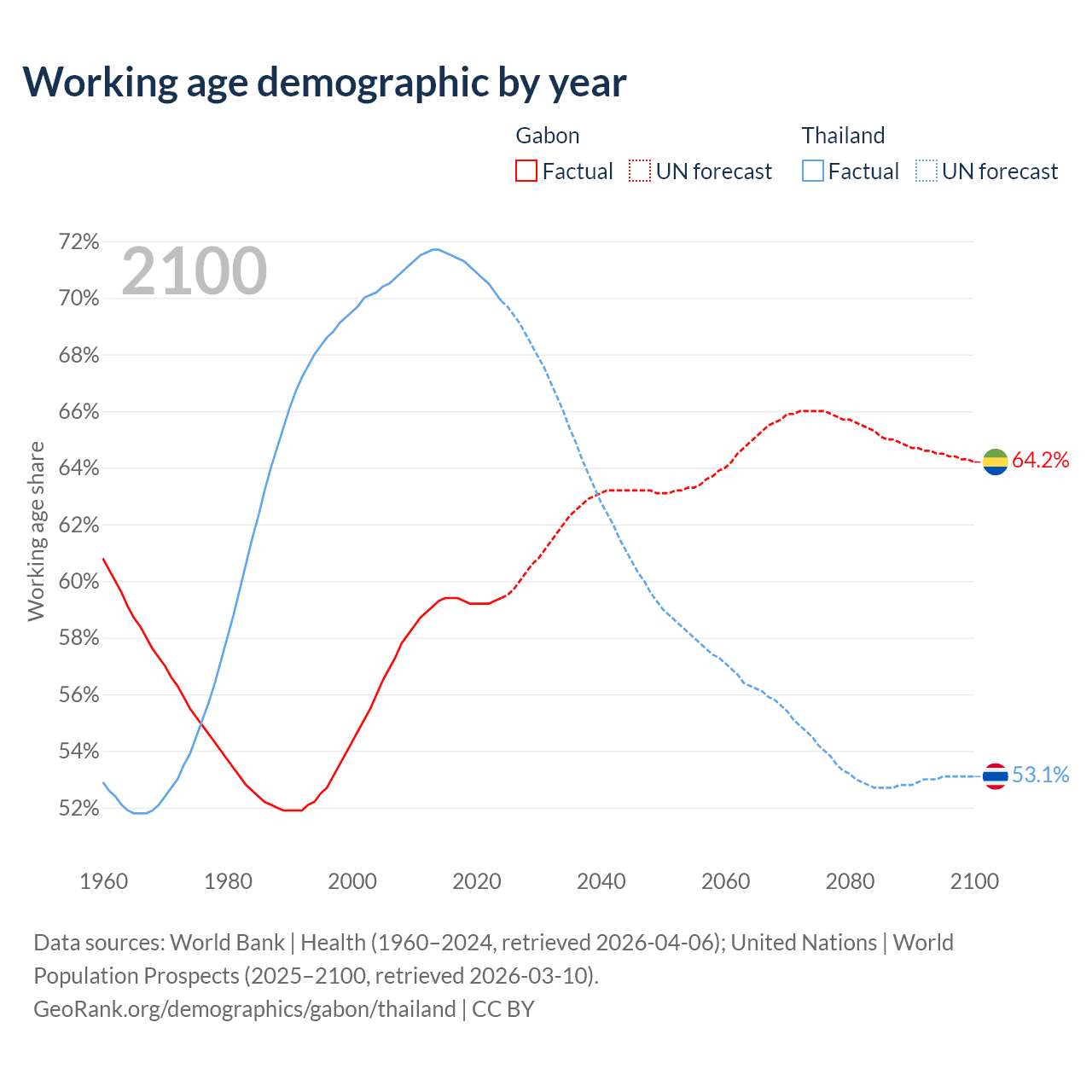Median age Gabon vs Thailand, 1960-2100