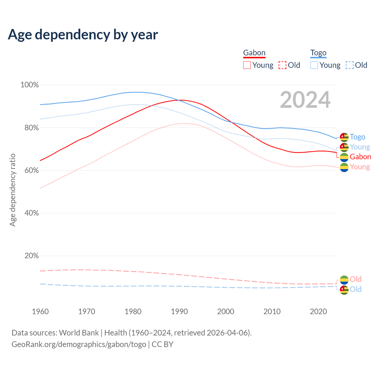 - Gabon is ranked 144/196 by median age (oldest to youngest) vs 166/196 for Togo.