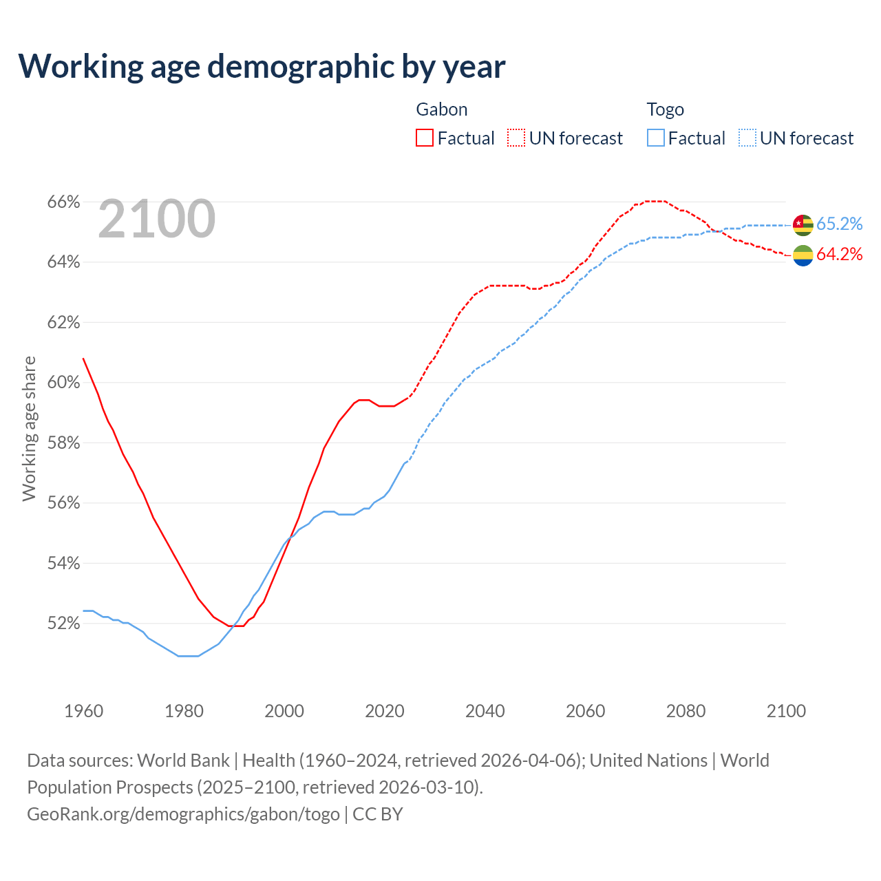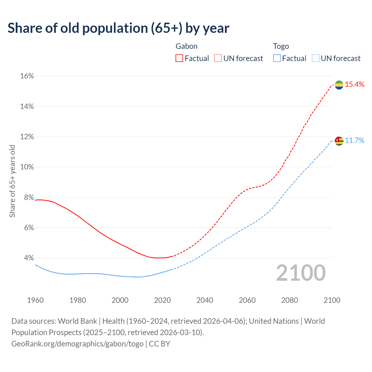 The share of older people aged 65 and over is 4.08% in Gabon and 3.21% in Togo. Life expectancy in Gabon compared to Togo .