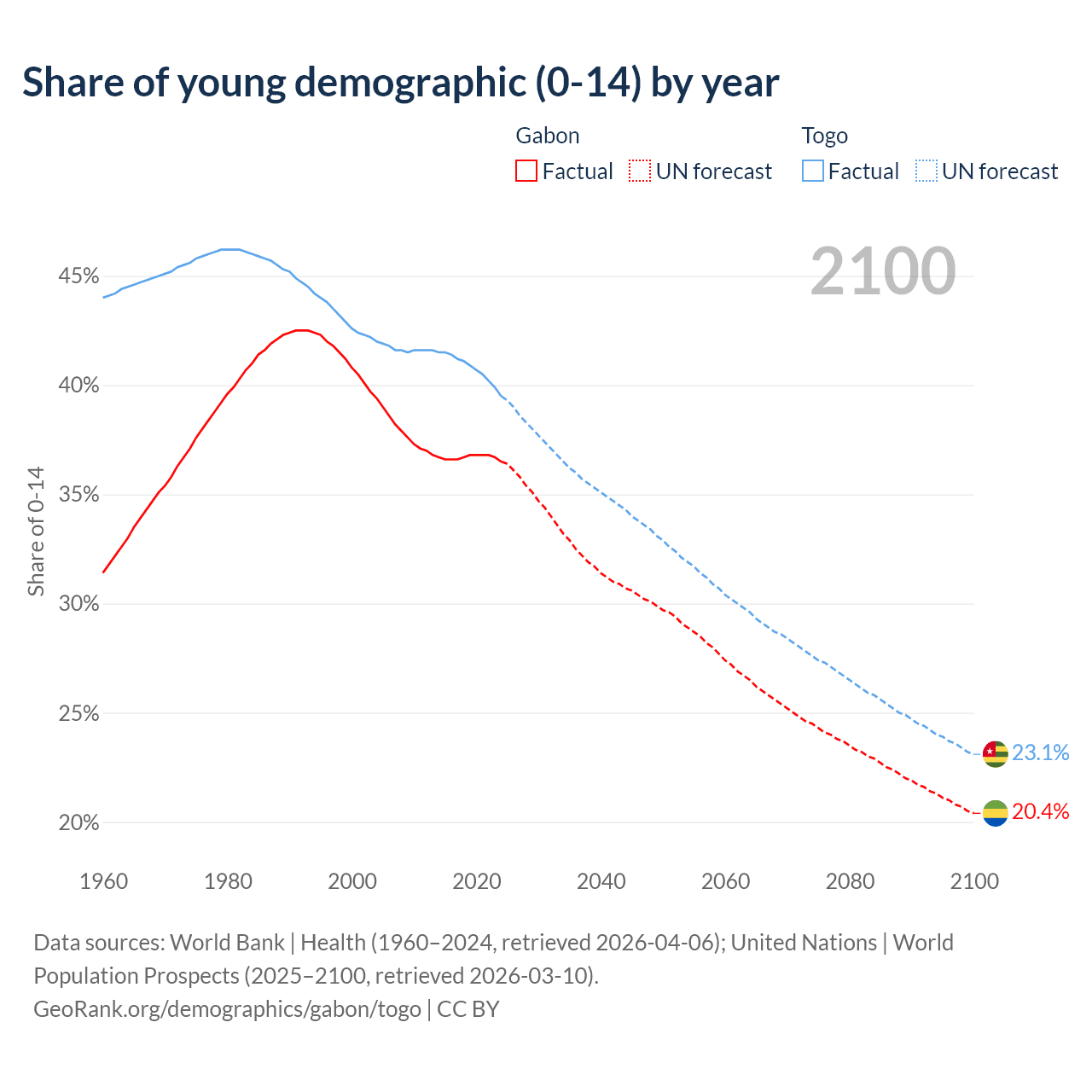 Median age Gabon vs Togo, 1960-2100