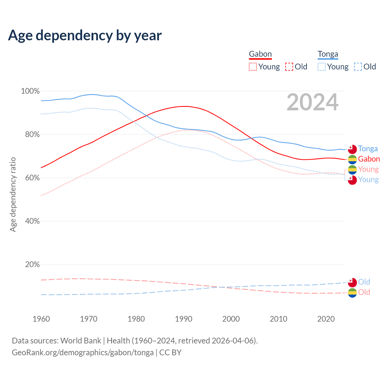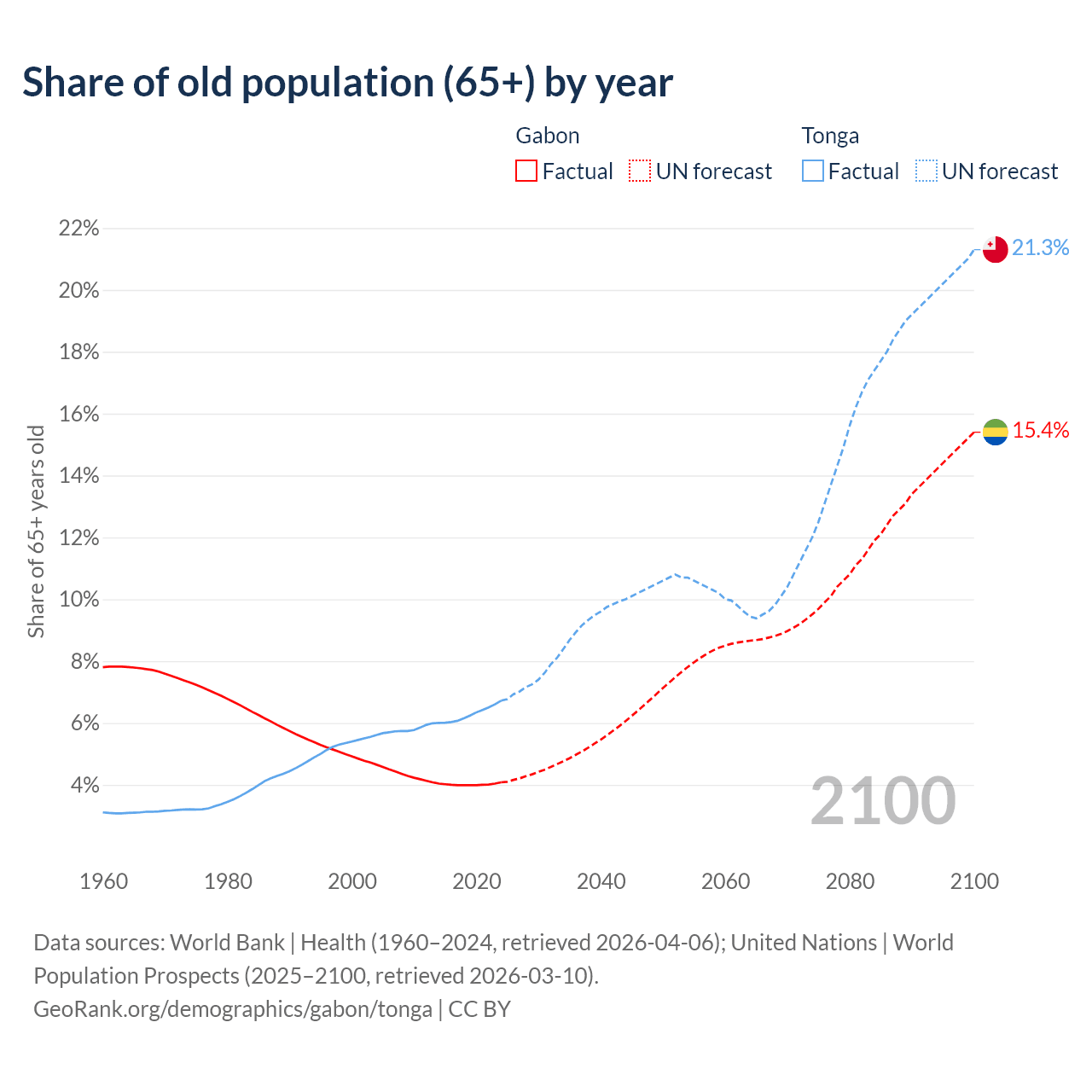 - The share of old-age demographic (65+) in Gabon is 4.08% vs 6.72% in Tonga.