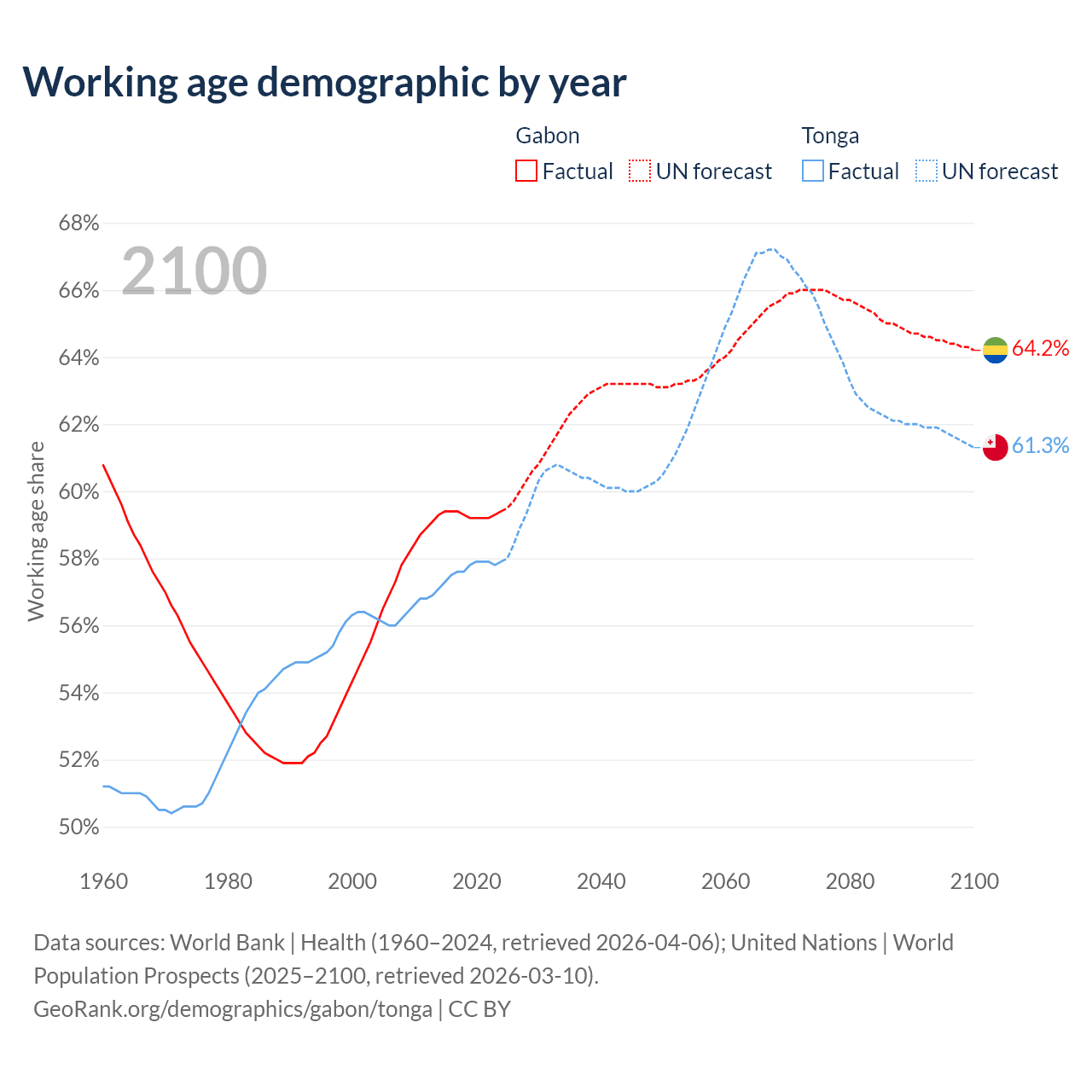 - Gabon has 1.58M working age adults (aged 15-64) vs 59.8K in Tonga.