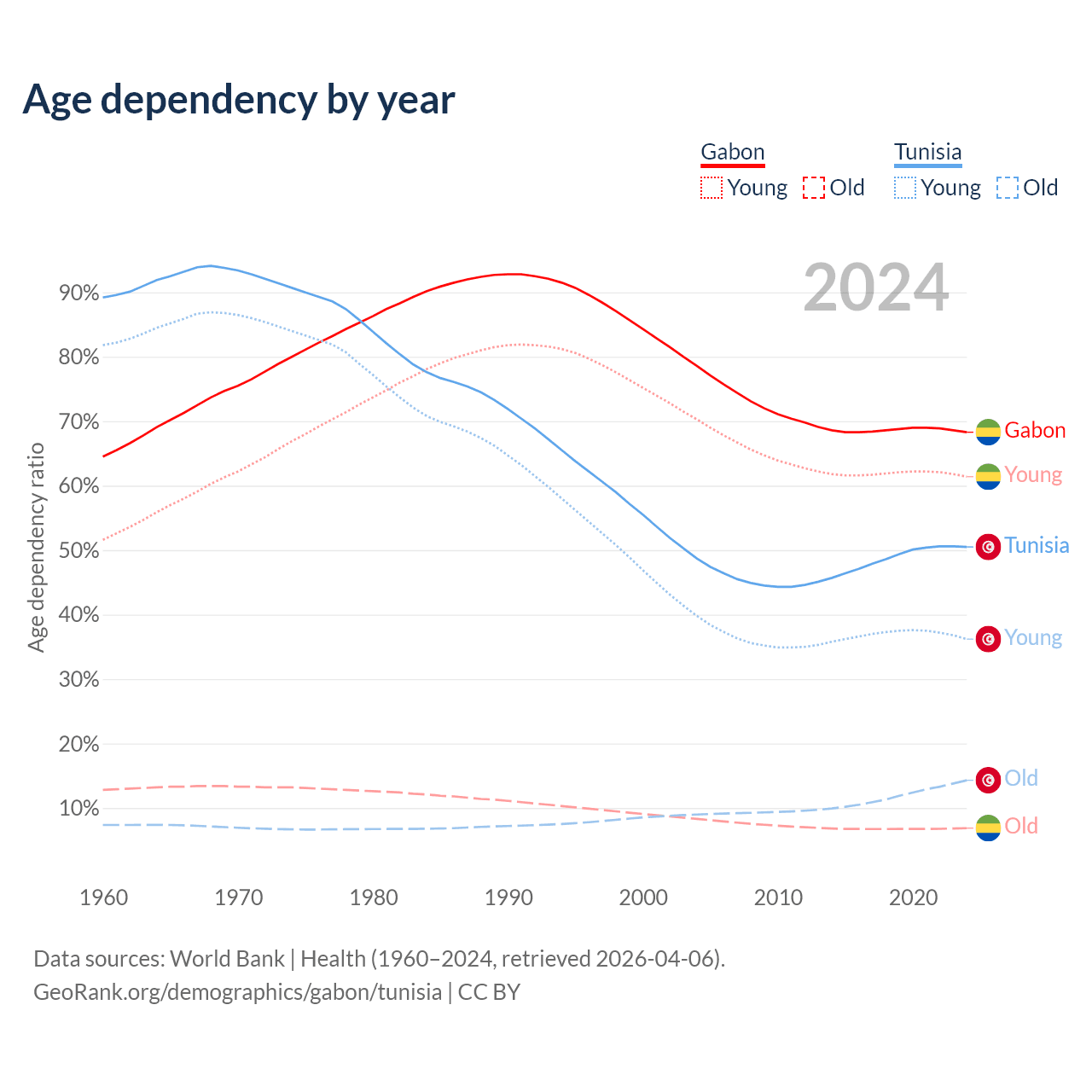 - Gabon is ranked 144/196 by median age (oldest to youngest) vs 86/196 for Tunisia.