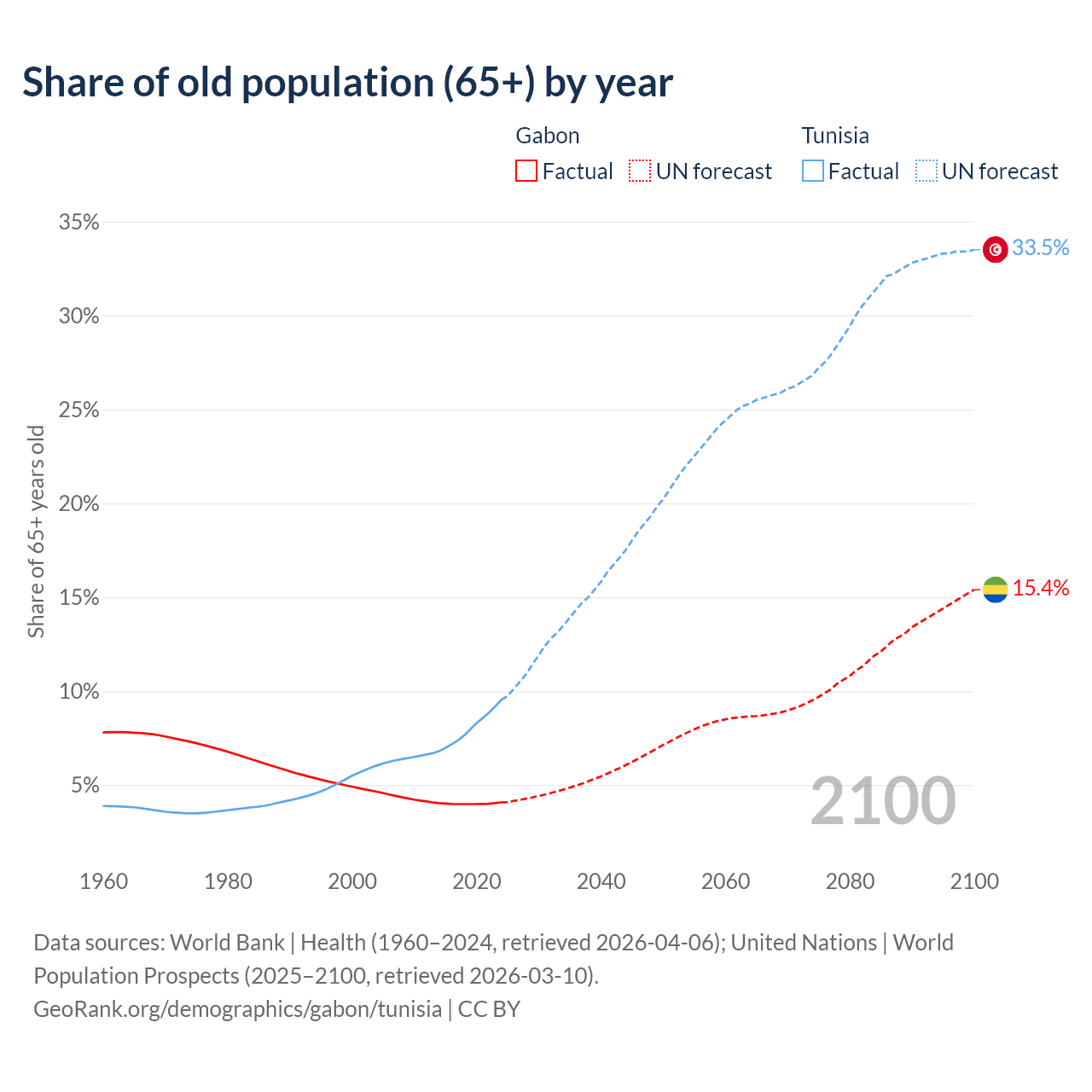- The share of old-age demographic (65+) in Gabon is 4.08% vs 9.53% in Tunisia.