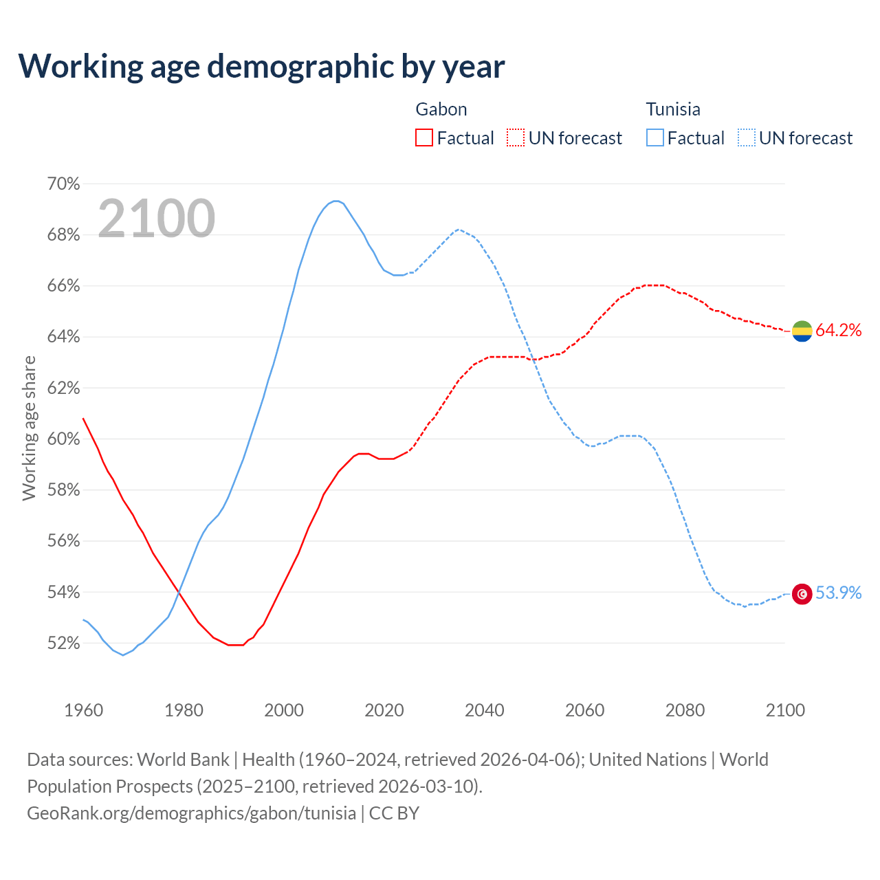The share of older people aged 65 and over is 4.08% in Gabon and 9.53% in Tunisia. Life expectancy in Gabon compared to Tunisia .
