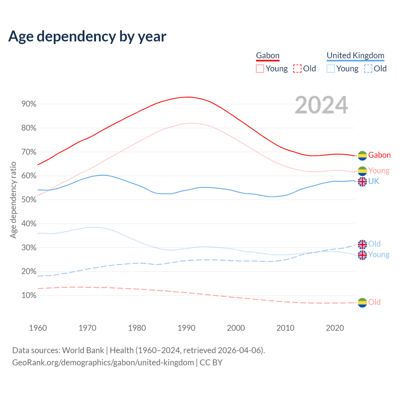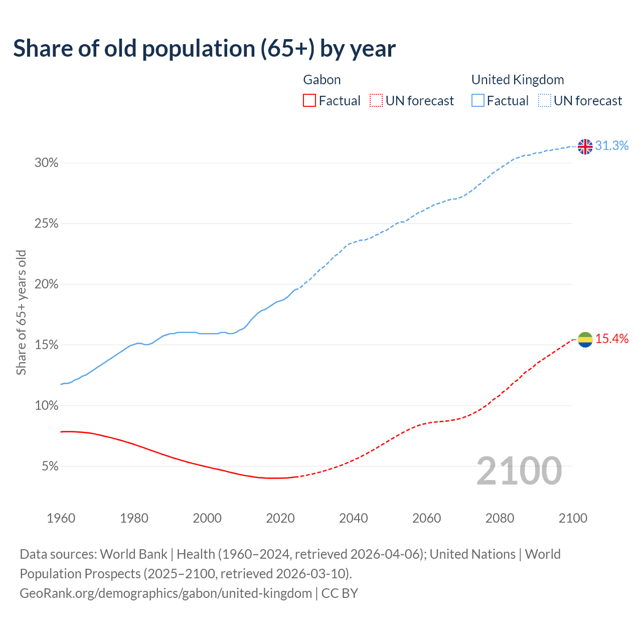 - The share of old-age demographic (65+) in Gabon is 4.08% vs 19.5% in the United Kingdom.