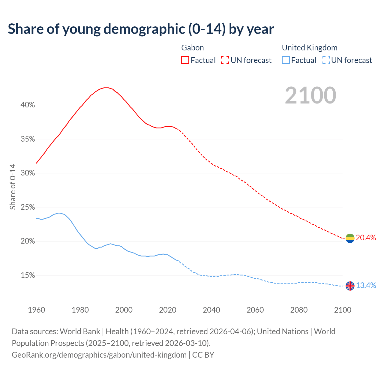 - The share of young demographic (0-15 years old) in Gabon is 36.5% vs 17.2% in the United Kingdom.