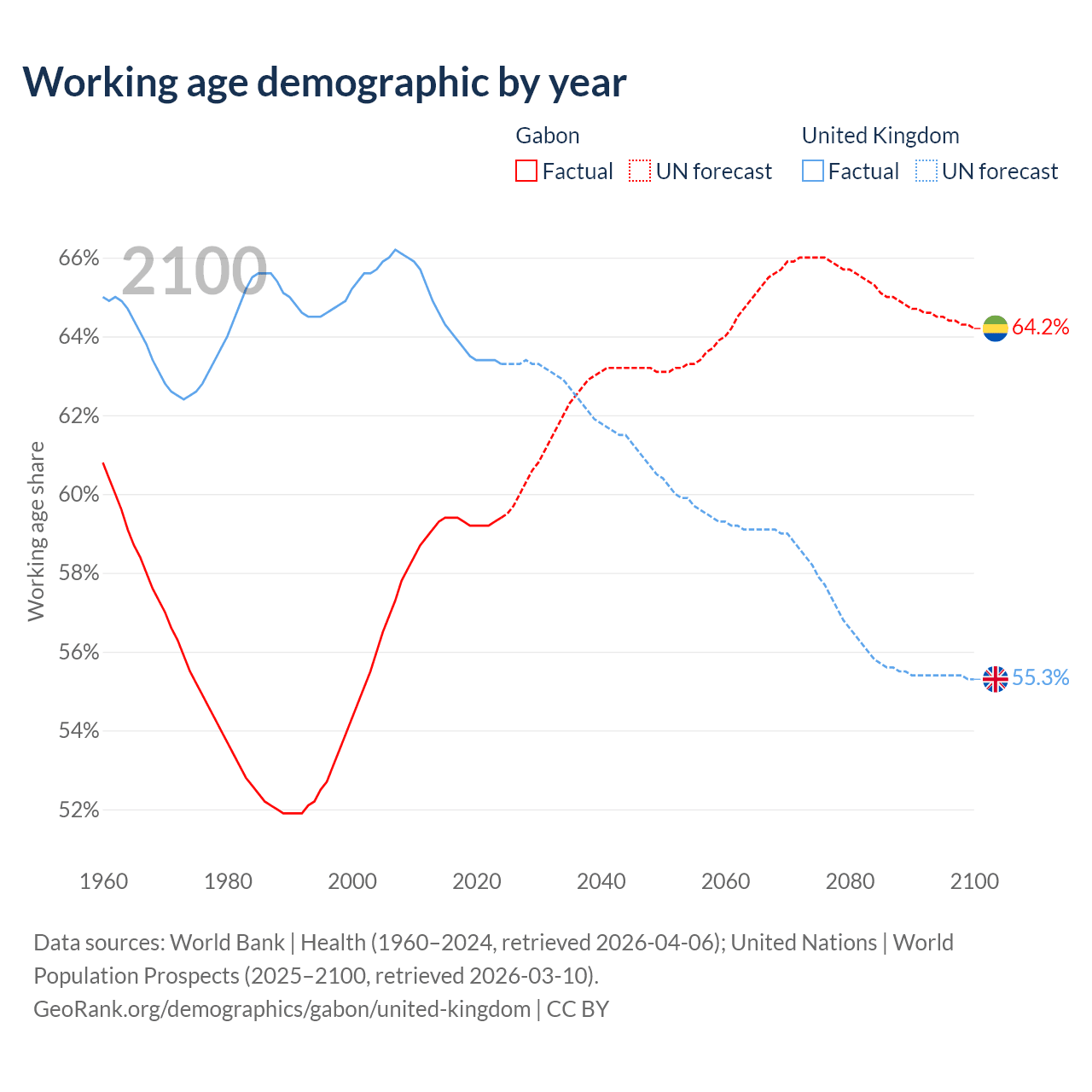 - Gabon has 1.58M working age adults (aged 15-64) vs 44.4M in the United Kingdom.
