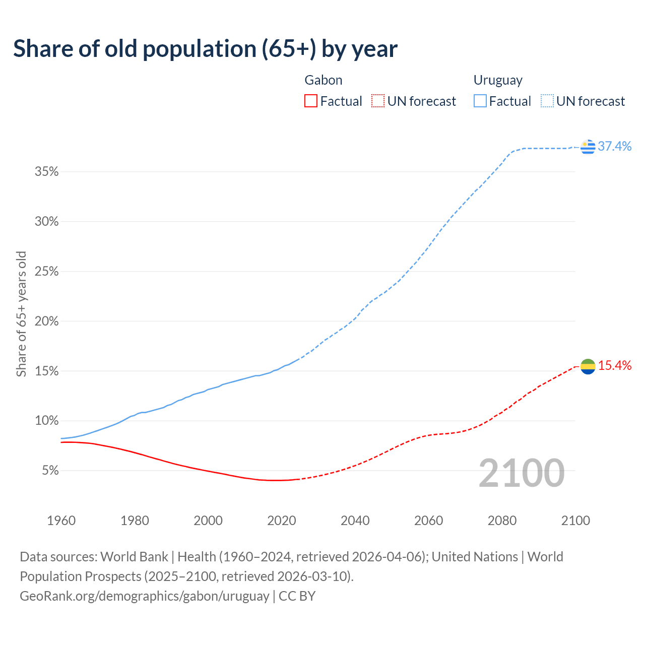 The share of older people aged 65 and over is 4.08% in Gabon and 16% in Uruguay. Life expectancy in Gabon compared to Uruguay .