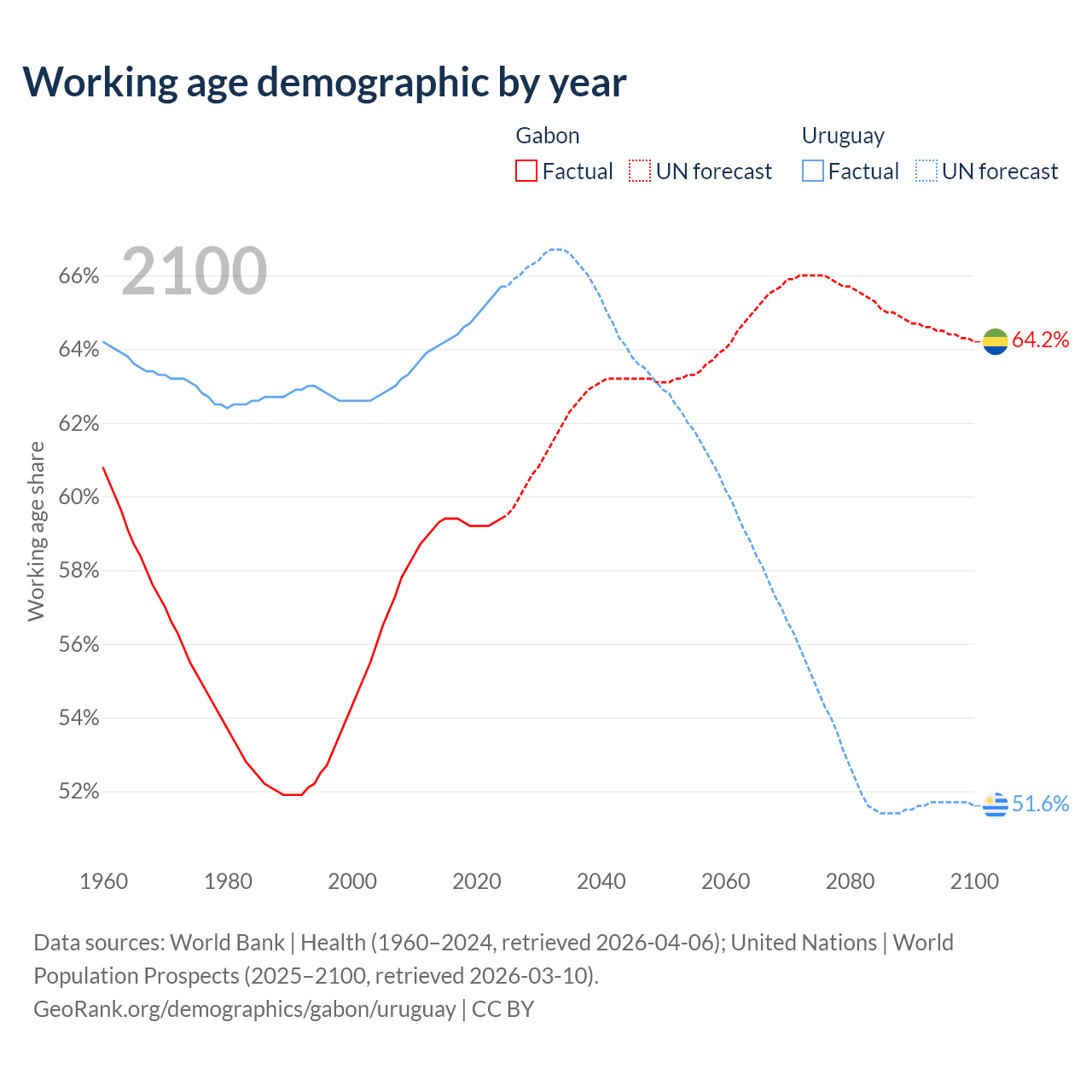 Median age Gabon vs Uruguay, 1960-2100
