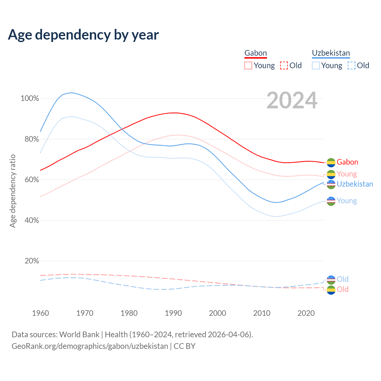 - Gabon is ranked 144/196 by median age (oldest to youngest) vs 116/196 for Uzbekistan.