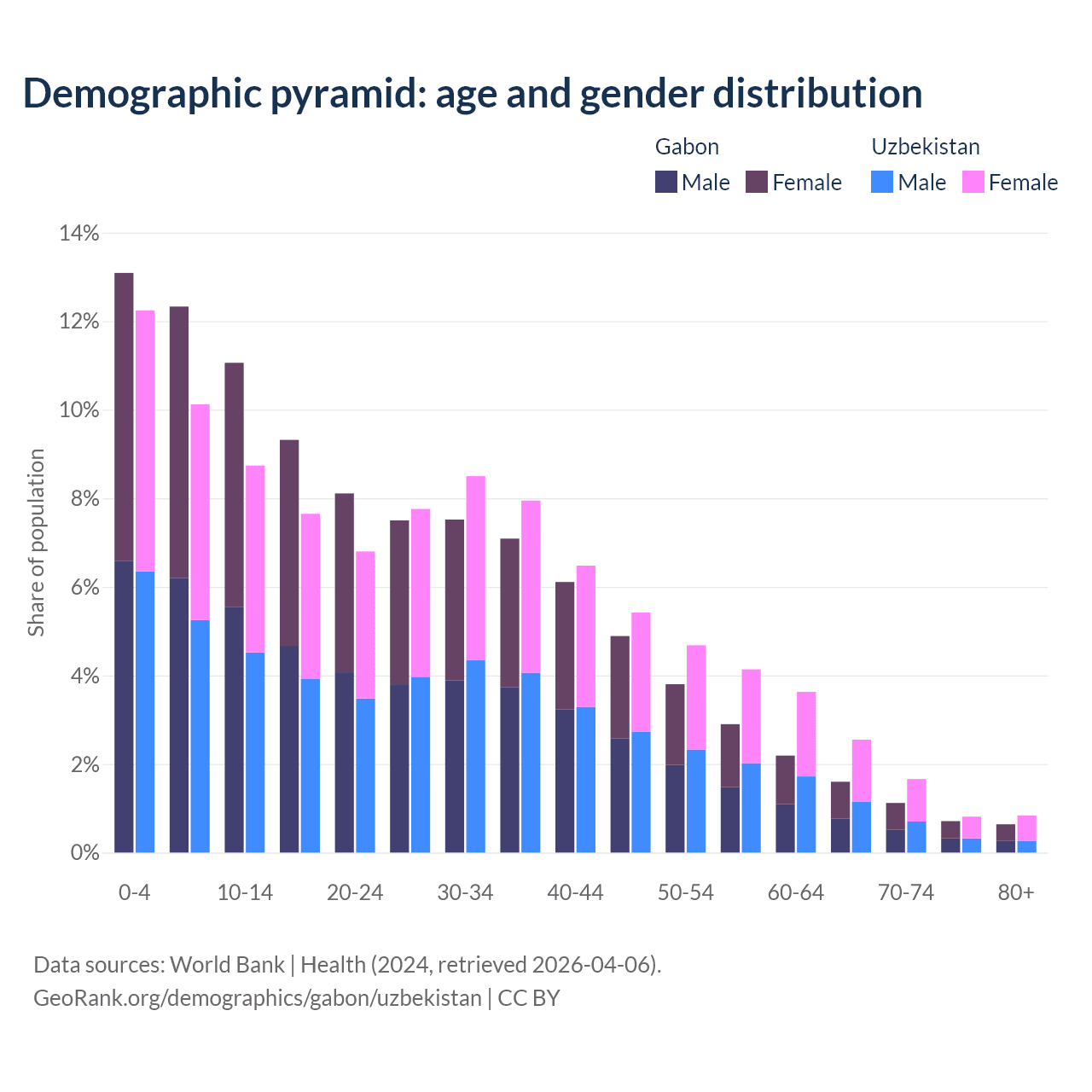 - The share of old-age demographic (65+) in Gabon is 4.08% vs 5.86% in Uzbekistan.