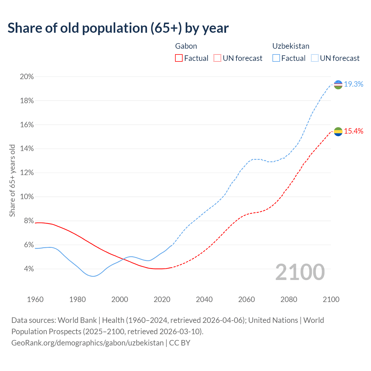 The share of older people aged 65 and over is 4.08% in Gabon and 5.86% in Uzbekistan. Life expectancy in Gabon compared to Uzbekistan .