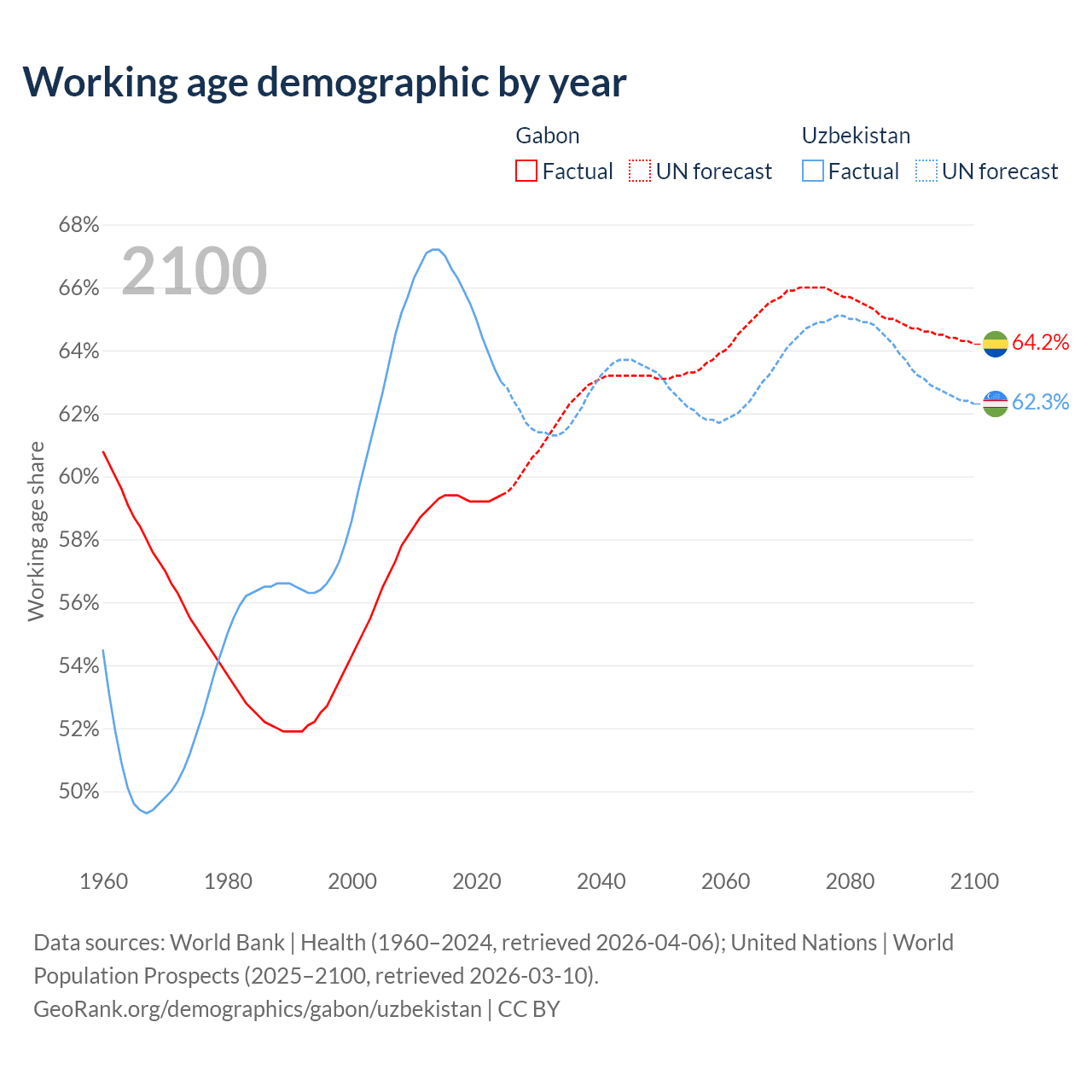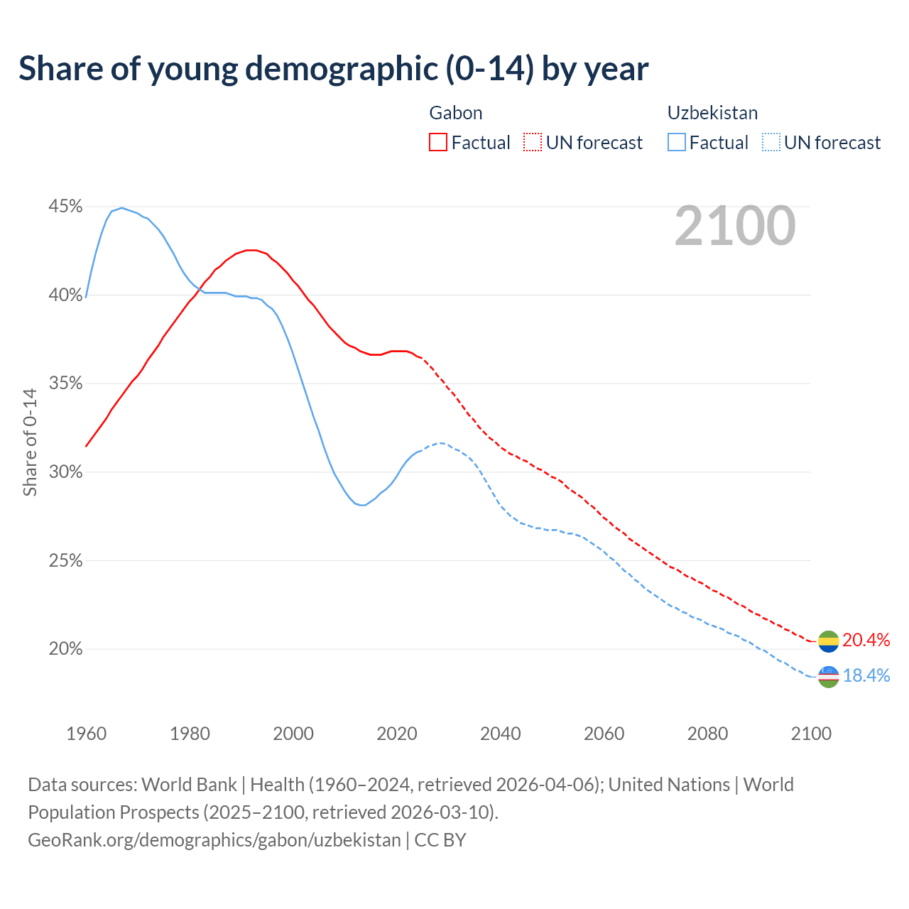 Median age Gabon vs Uzbekistan, 1960-2100