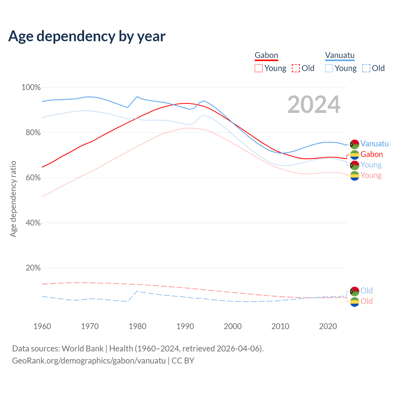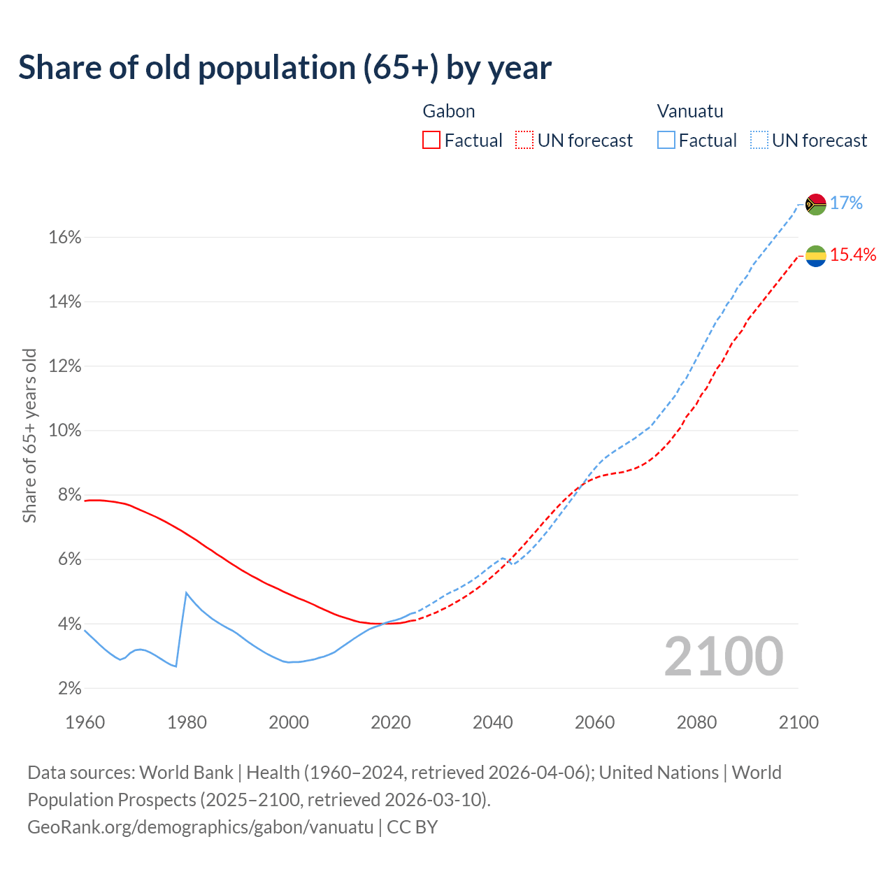 The share of older people aged 65 and over is 4.08% in Gabon and 4.3% in Vanuatu. Life expectancy in Gabon compared to Vanuatu .
