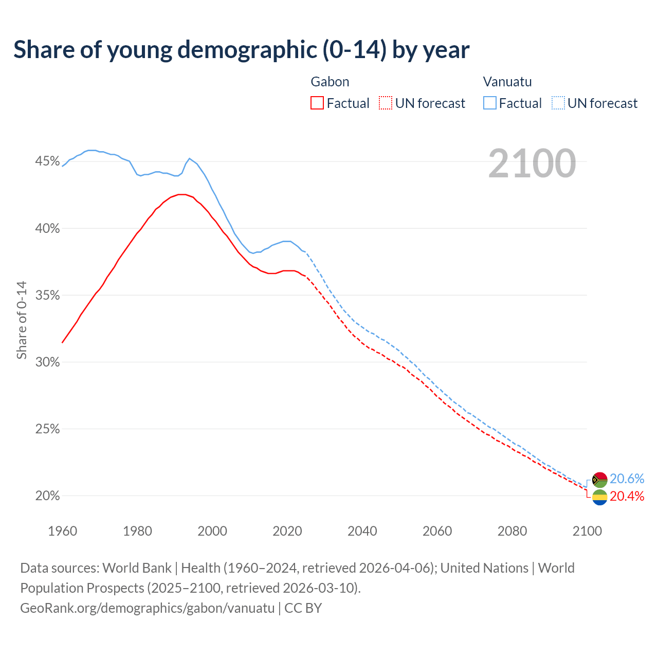 - The share of young demographic (0-15 years old) in Gabon is 36.5% vs 38.3% in Vanuatu.