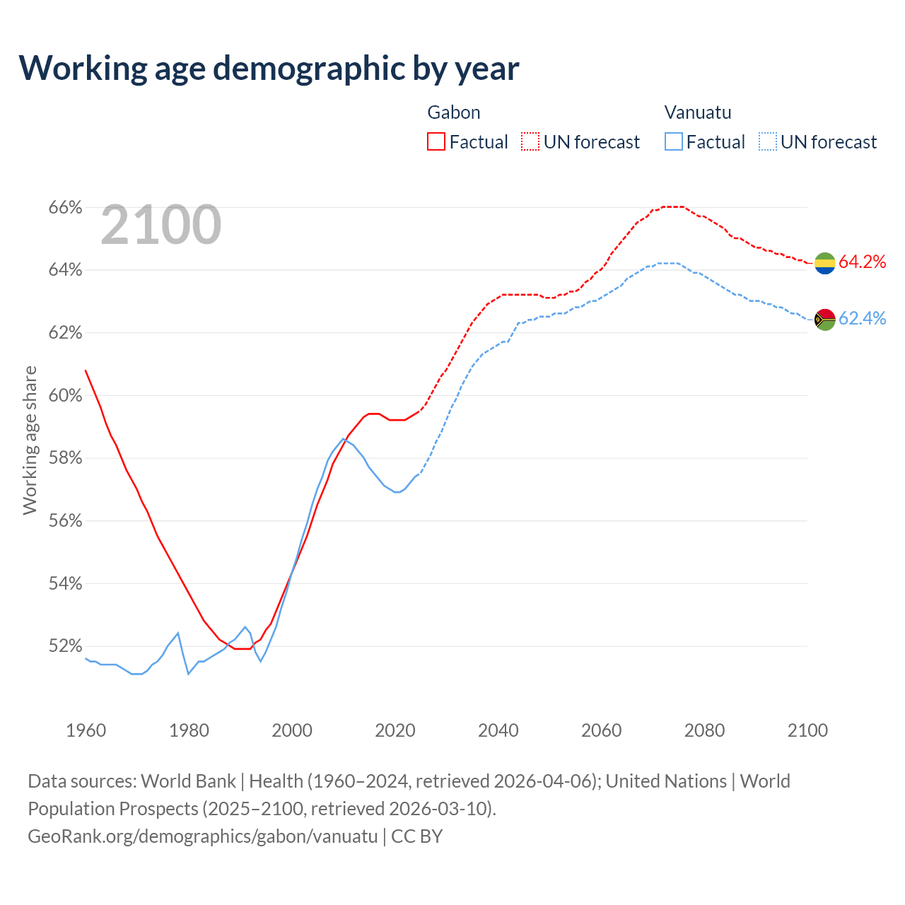 - The share of old-age demographic (65+) in Gabon is 4.08% vs 4.3% in Vanuatu.