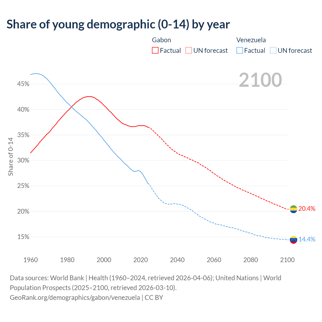 - The share of young demographic (0-15 years old) in Gabon is 36.5% vs 25.5% in Venezuela.