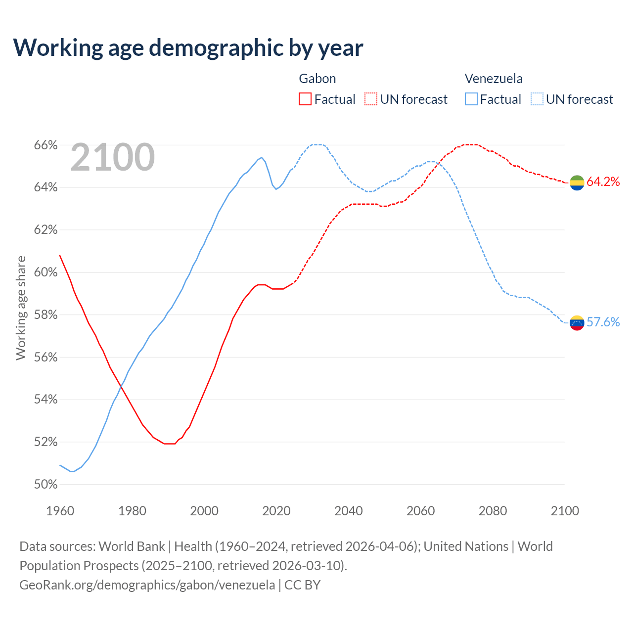 - The share of old-age demographic (65+) in Gabon is 4.08% vs 9.68% in Venezuela.